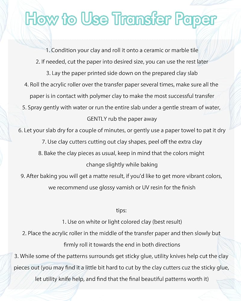 • Care and Instruction: We suggest use white color polymer clay to print the perfect effect. Spritze water on the transfer paper, wait a minute, and wipe the water thouroughly help the pattern fully connect to the clay and thus aviod the picture tear. We also share the steps for using transfer paper, please refer to the detail photo.