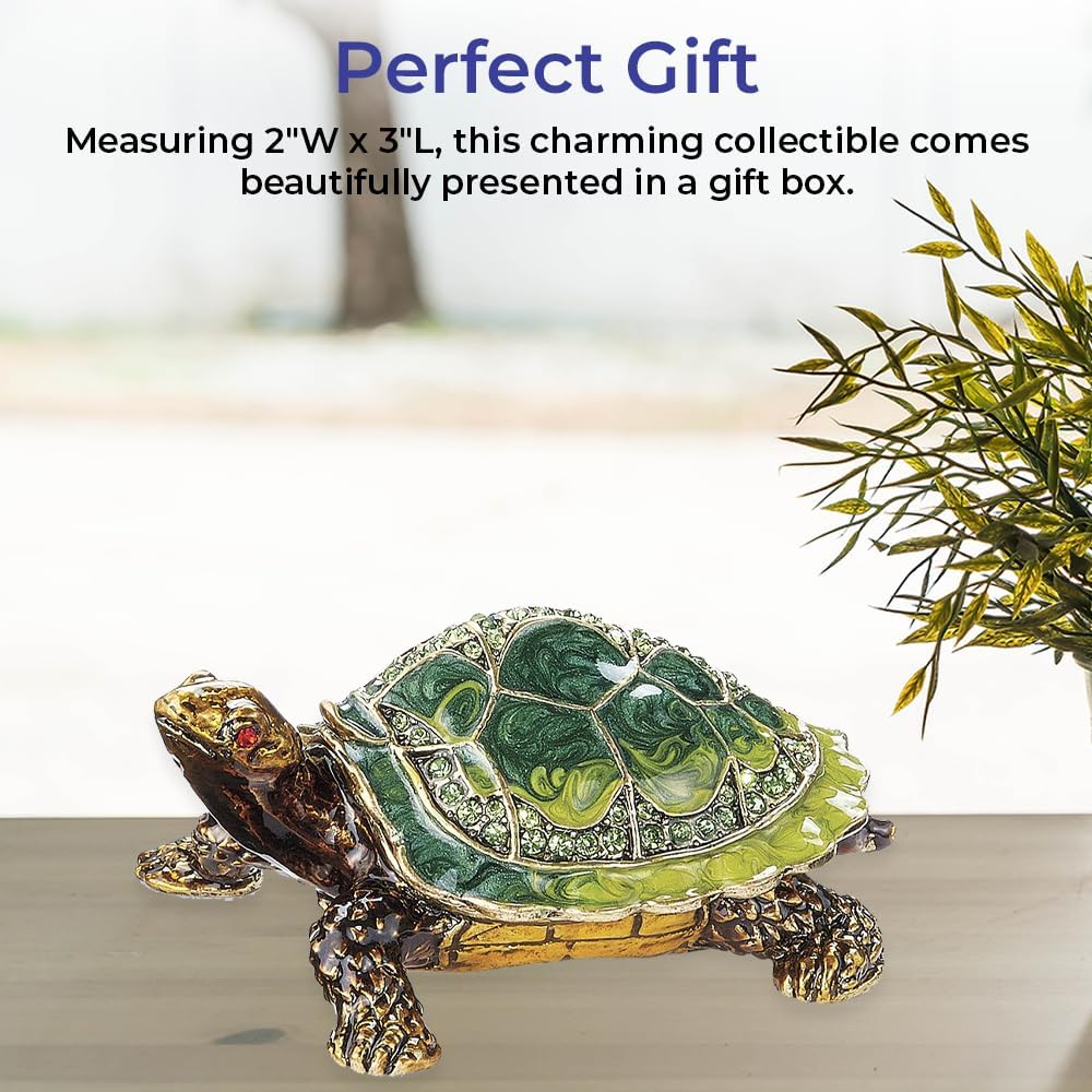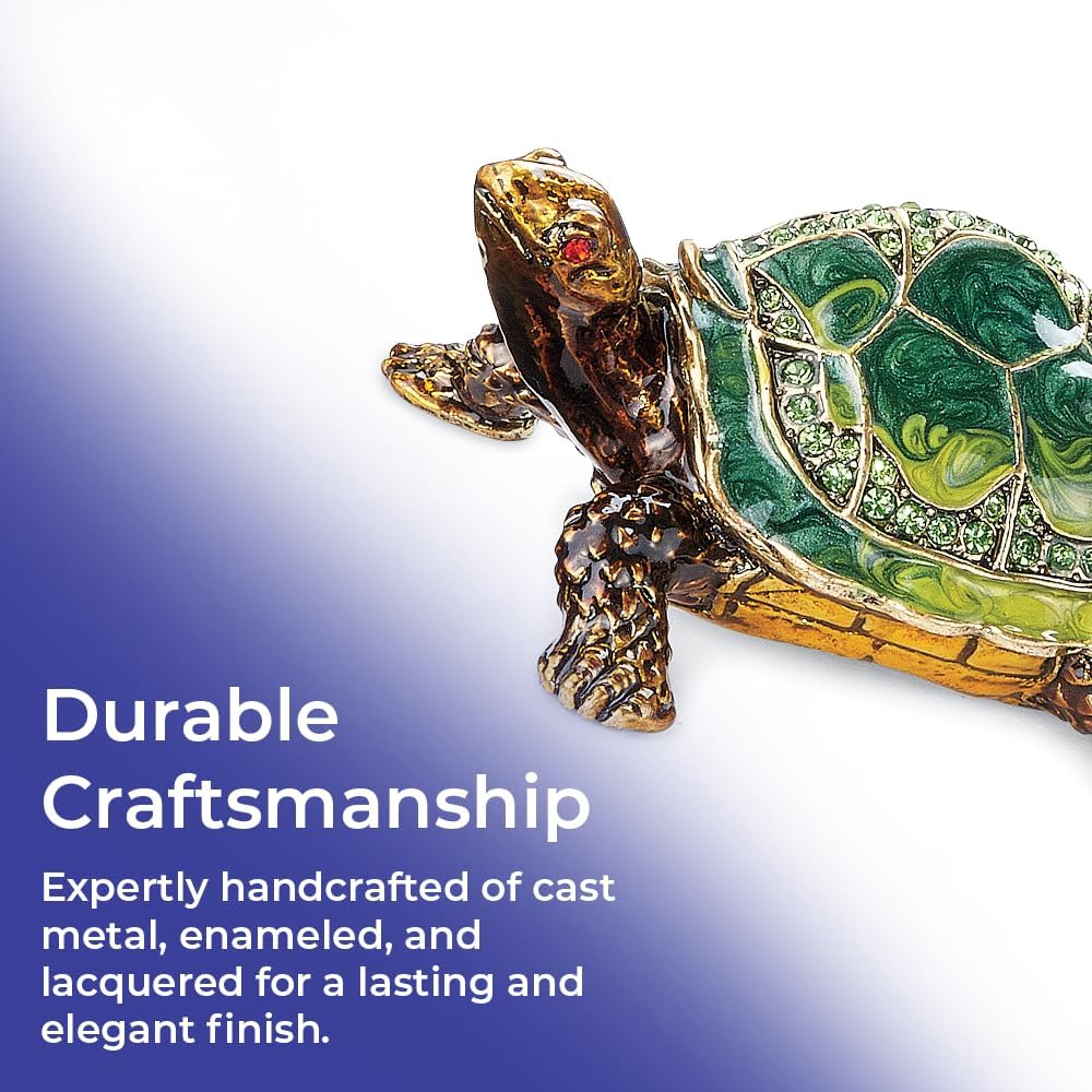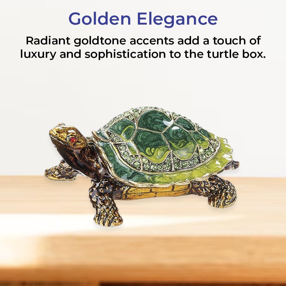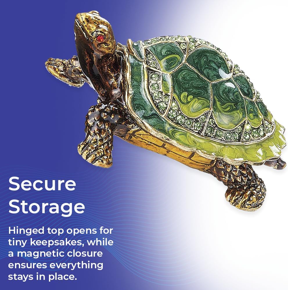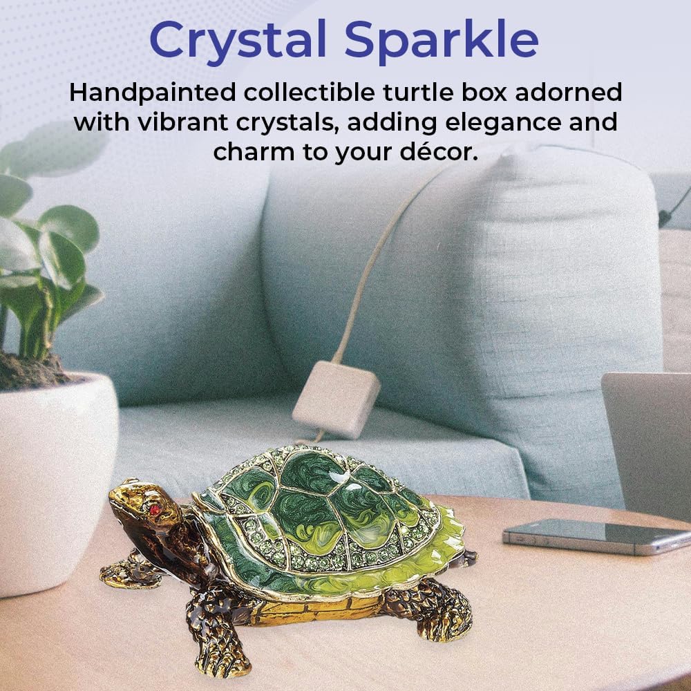 إبهار التحصيل: يتلألأ صندوق السلاحف المصحوب باليد مع بلورات محددة يدويًا وتفاصيل مينا غنية ؛ قطعة لافتة للنظر تضيف الجمال والنزوة إلى أي مجموعة
