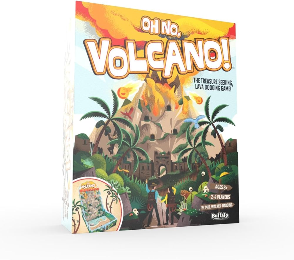Oh No Volcano! The treasure seeking, lava dodging game! Climb the legendary volcano to claim its ancient treasures. Peril lies ahead on every turn. Be the first explorer to collect your riches and avoid the fiery fury of the volcano. Will you triumph with treasure, or will you be left screaming, oh no volcano!
