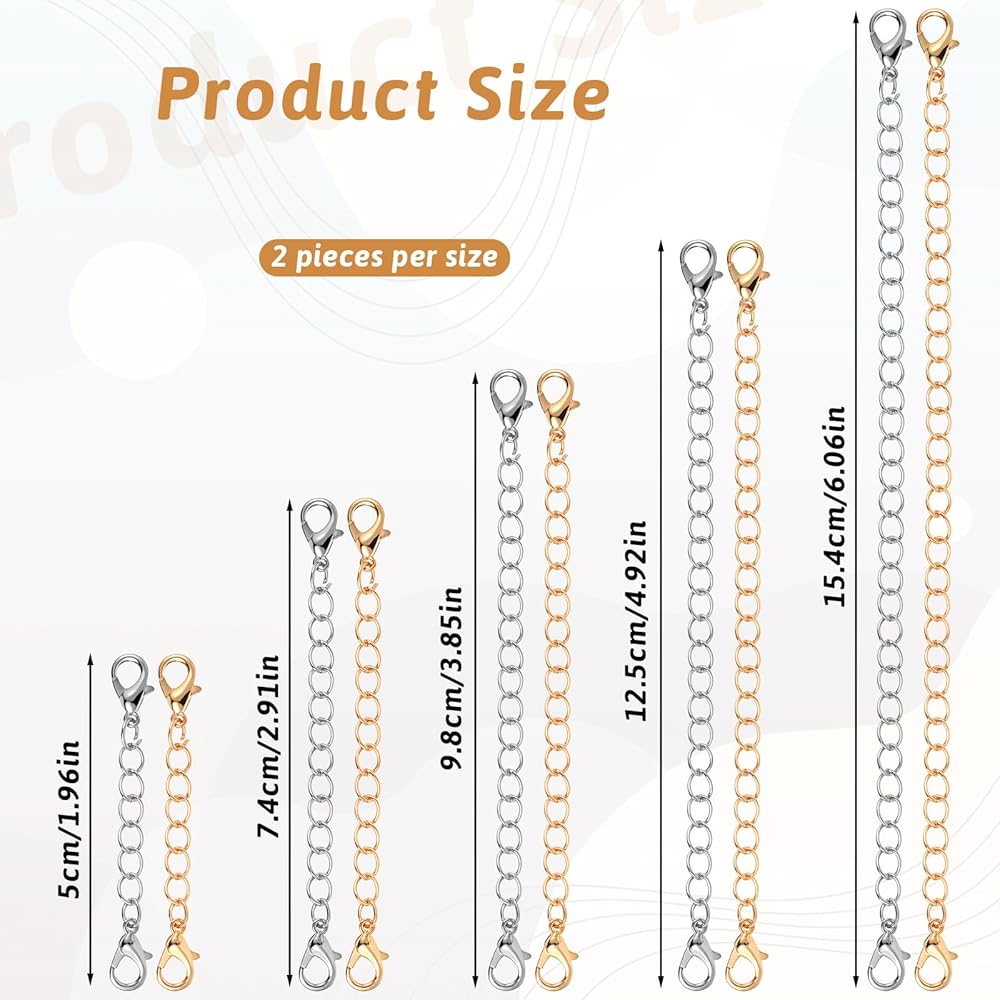 Introducing the Giantree Gold and Silver Necklace Extenders for Women, a versatile and essential accessory for any jewelry collection. This set includes 10 chain extenders for necklaces, providing a variety of sizes (2”, 2.91”, 3.85”, 4.92”, 6.06”) to meet your different needs. Crafted from high-quality zinc alloy and iron, these necklace chain extenders are durable, hypoallergenic, and designed to last.