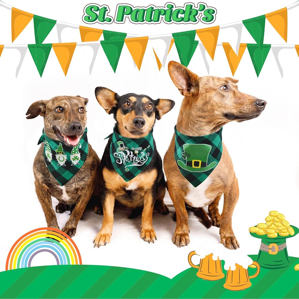 They are green plaid bandana with top hat pattern, plaide puppy bandana with leprechaun pattern, and plaid cat st patricks scarf with "Happy St. Patrick's Day"