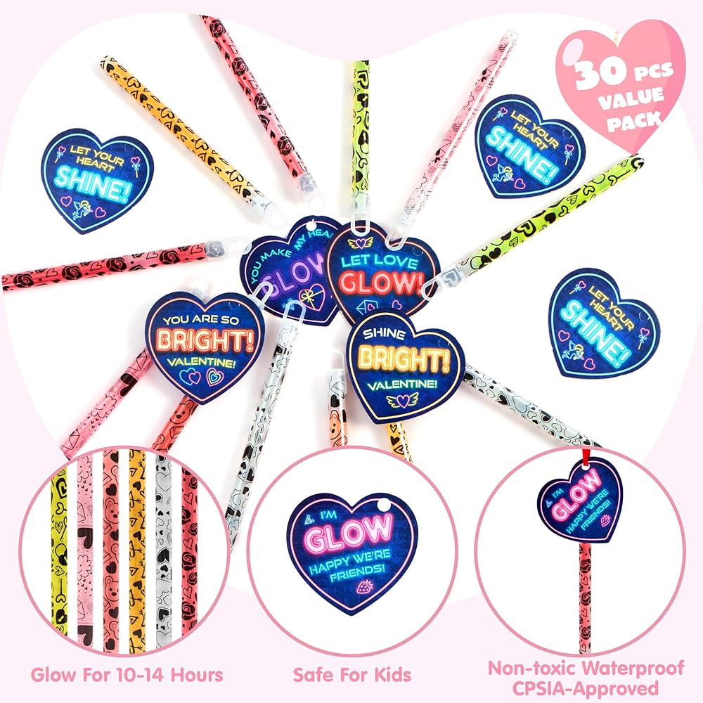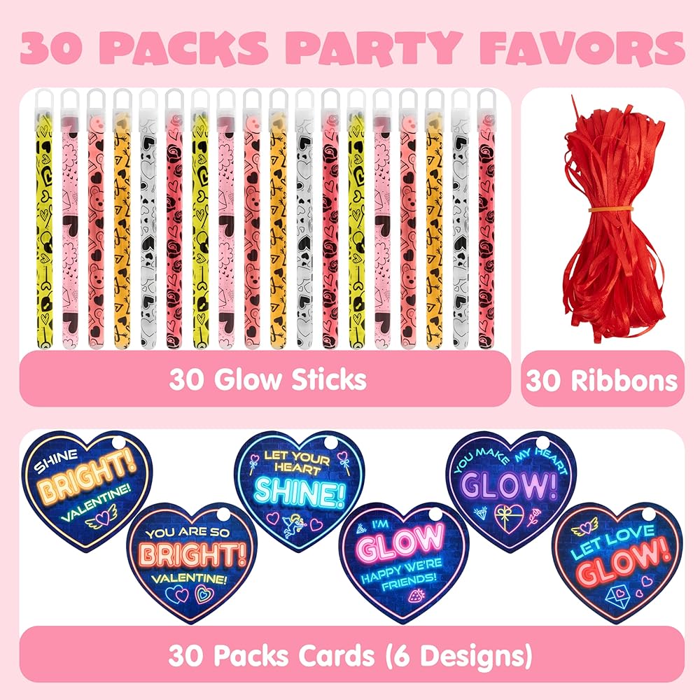 Joyin 30 حزم بطاقات هدايا عيد الحب مع عصي توهج كبيرة مشرقة لصالح حفلات عيد الحب ، عصي توهج مقاومة للماء من أجل فالنتينز فصول الصرف ، جوائز فصول عيد الحب ،