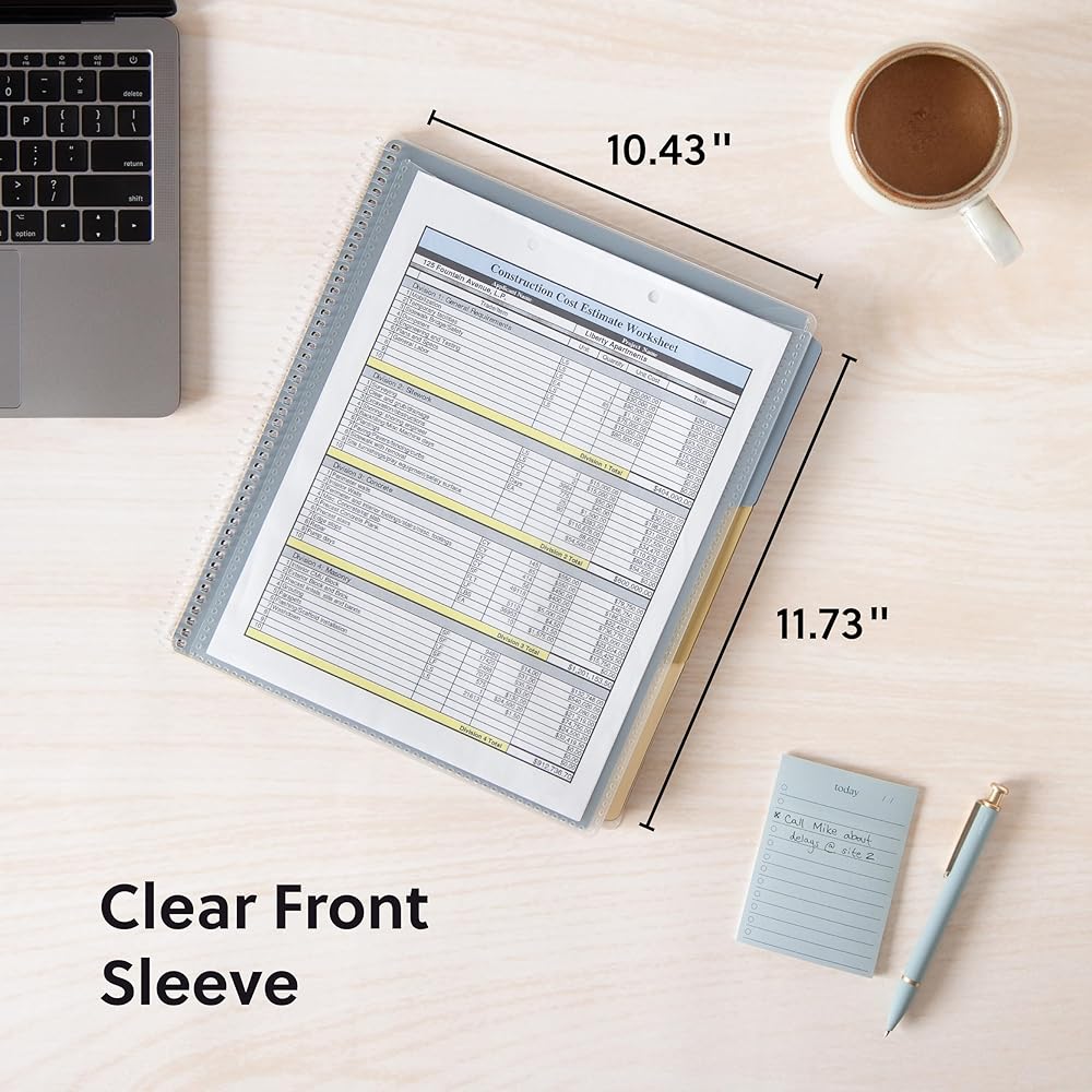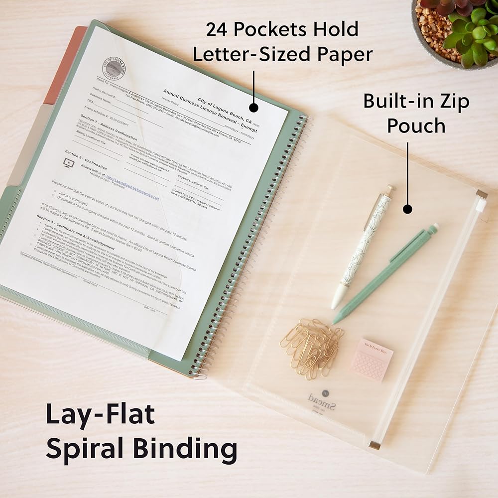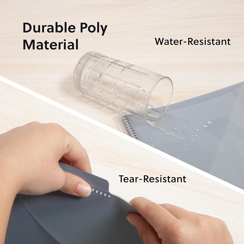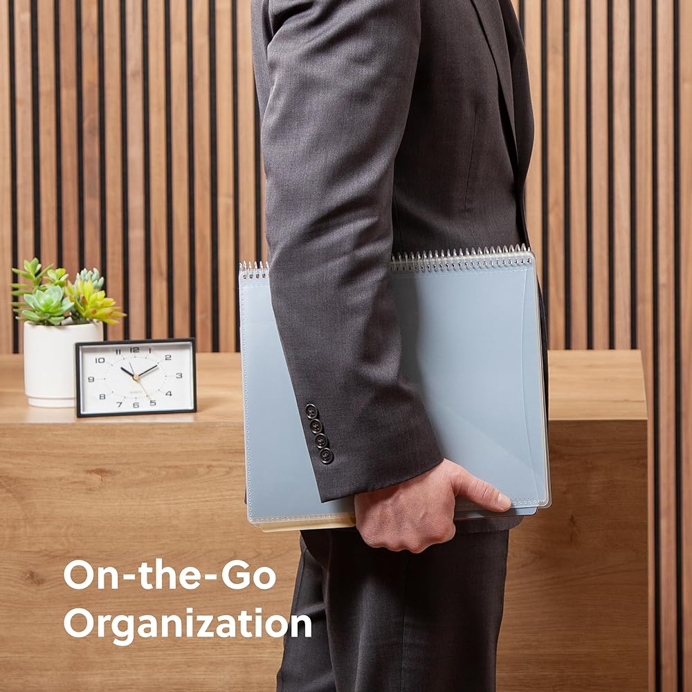 PRACTICAL DESIGN: The slash pockets can hold up to 25 sheets each; the spiral-bound design allows the office supply organizer to lay flat for convenience and rotate 360° for easy viewing; tear-resistant and water-resistant poly cover material ensures long-lasting durability