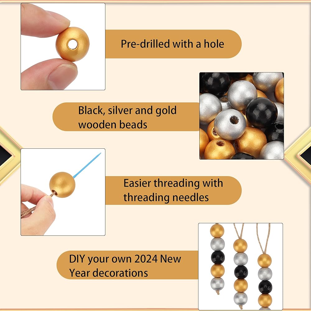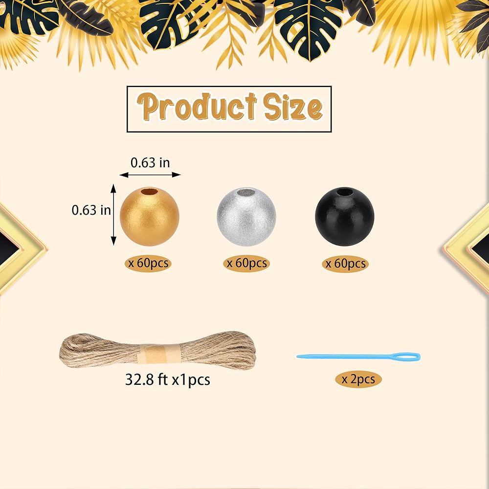 • Great Value Set: Package includes 60pcs black wood beads, 60pcs silver wood beads, 60pcs gold wood beads, 2pcs threading needle and 1pcs 10m/33ft hemp rope. Sufficient quantity can match your various New Year, Christmas, birthday and graduation decoration needs.