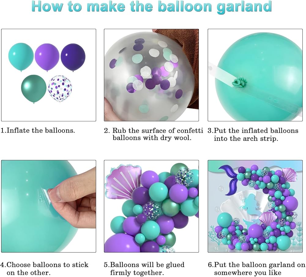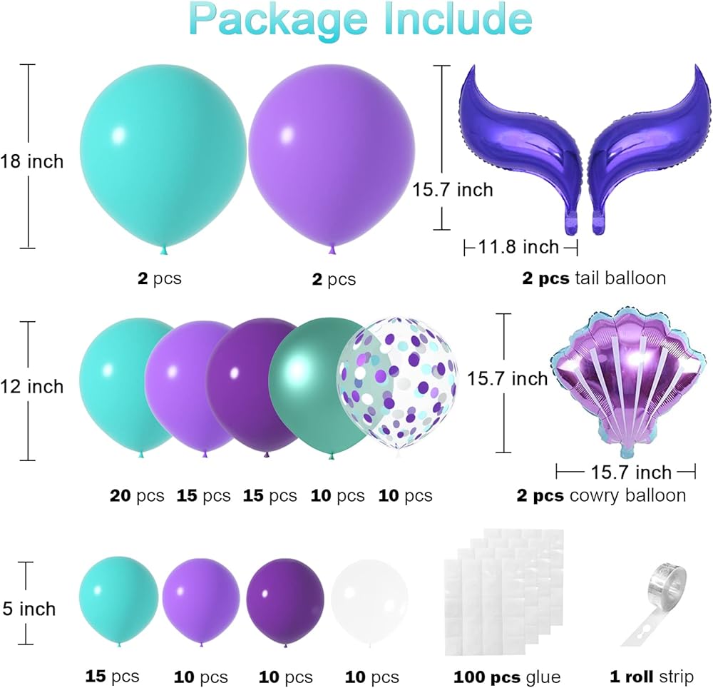 • طقم قوس بالون حورية البحر: تشمل 129pcs قوس بالون حورية البحر مع 18 بوصة بالون أرجوانية/تيل ، 70 ٪ 12 بوصة البالونات ، 45pcs 5 بوصة البالونات ، 18 بوصة البالون ميتالك بيربل بيربل ، البالون بقشرة البحر الأرجواني 18 بوصة ، و 5 أجزاء من غلاف البالون والبالون قطاع البالون