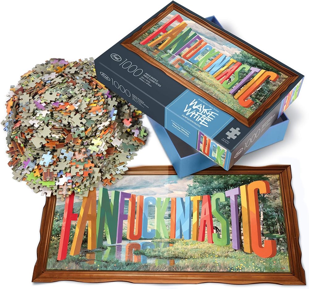 500 PIECE PUZZLE: This 500 piece puzzle measures 22.5 x 16.5 inches (57cm x 42cm) and features an original artwork by Wayne White. A color insert of the art is included in each box. A 10" x 13.5" color insert of the art is included in each box.