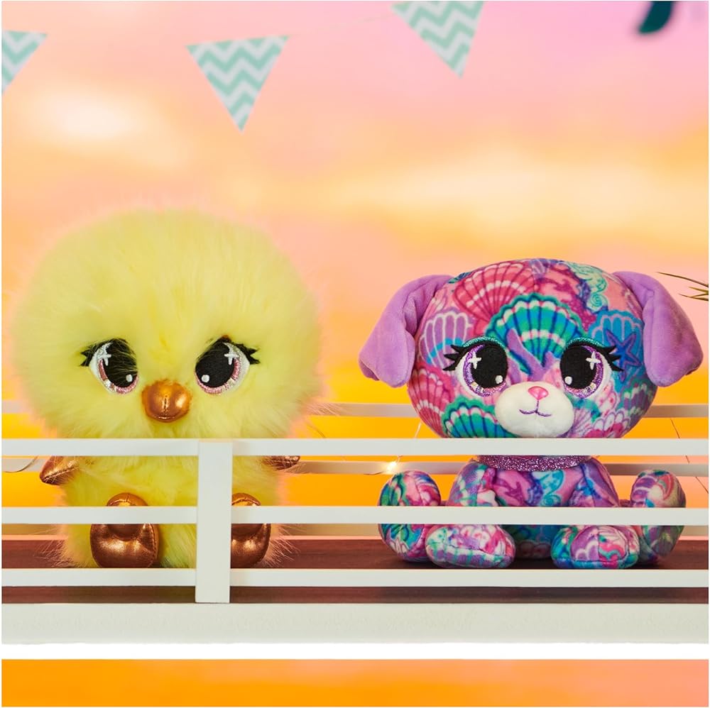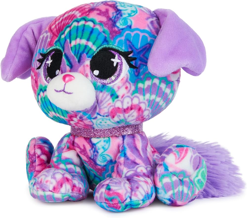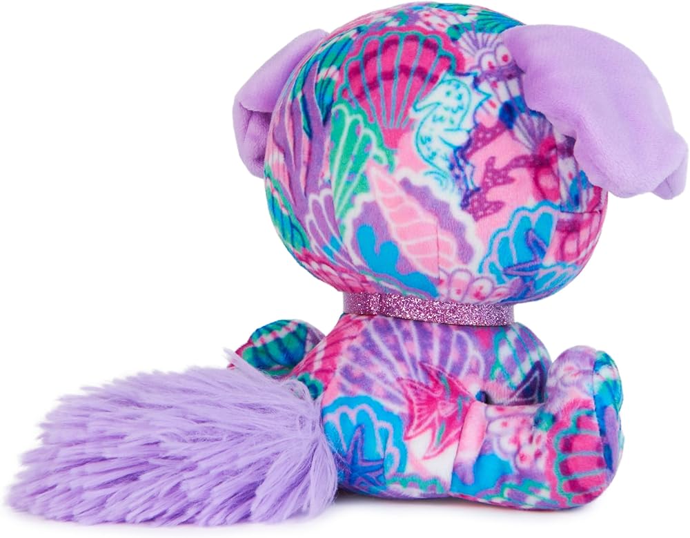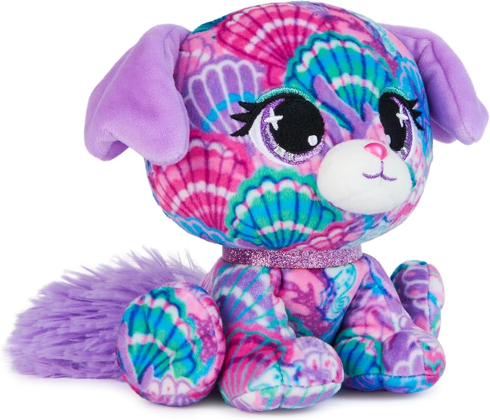 Shelly Newport lives for beach days! This delightful doggie is covered in a whimsical seashell print, and she wears a pop of blue eyeshadow on her lovely lilac eyes. She has short, floppy purple ears and a matching sparkling glitter collar. She enjoys soaking up the sun on Laguna Beach and building sandcastles with friends. P.Lushes Pets are designer plush from all around the world who love to look their best. Everywhere is your personal runway with P.Lushes Pets! This stylish squad of fabulous fashionistas serves chic with a sprinkle of attitude and a whole lot of glitter. Luxe, premium fabrics and a sparkling collar enhance their fashion-inspired looks! Collect them all, from scented Juicy Jam styles to birthstone-inspired Gem Stars, to find all Limited Edition and Special Edition chase plush.