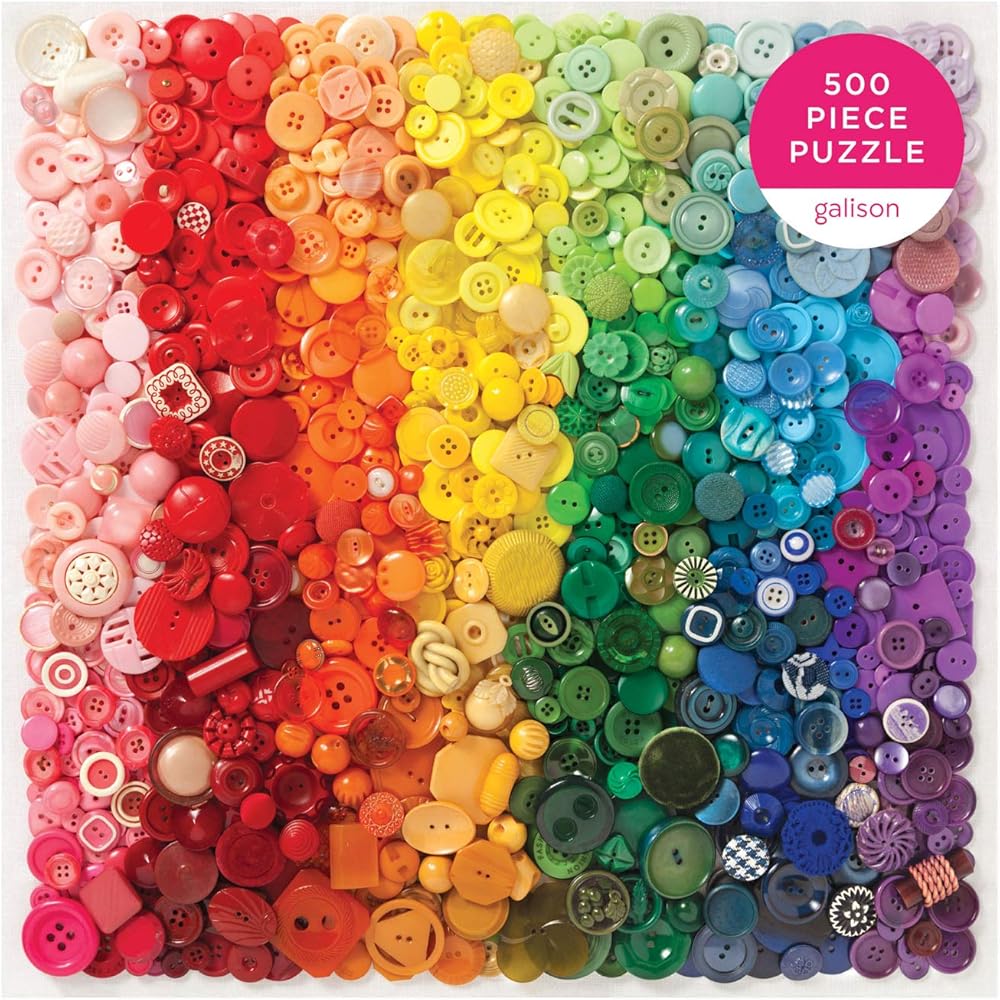 500-Piece puzzle: the 500-Piece rainbow buttons puzzle is a fun challenge for children and adults. The mesmerizing finished puzzle measures 20” x 20” so doesn't require much room to complete.