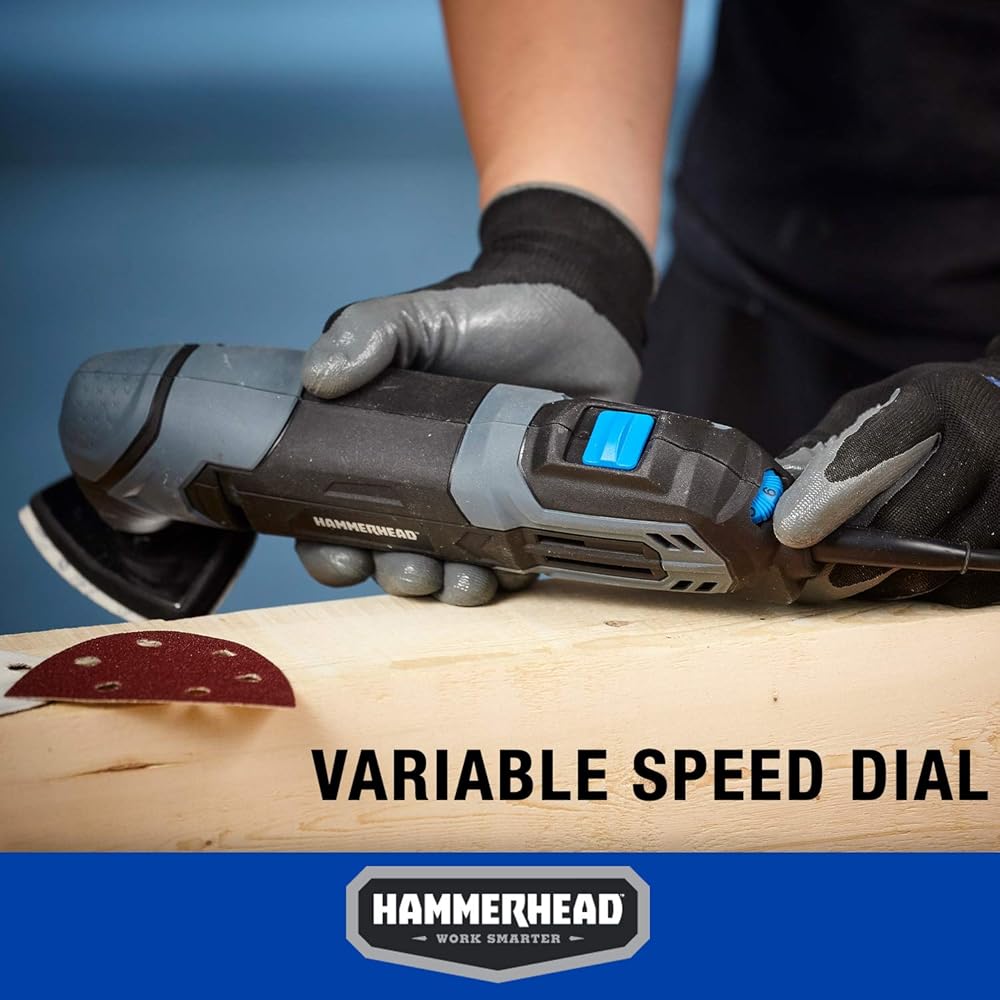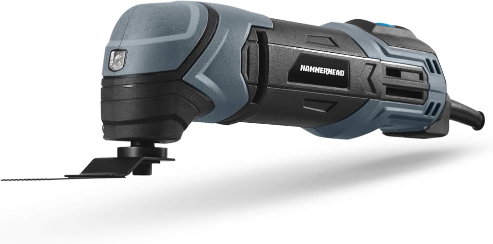 The Hammerhead oscillating multi-tool features a powerful 2. 2-Amp motor that delivers 20, 000 oscillations per minute (OPM) for action as a detail sander, saw, scraper, or grout removal tool. It is a versatile multi-tool designed to quickly tackle jobs that once required long hours and expensive specialty tools. The universal collet system is compatible with standard oscillating multi-tool accessories on the market and in the box a kit of sandpaper and commonly used attachments is included. Thanks to its power and versatility this tool is great for trimming door jambs, flooring installation, taking up vinyl laminate flooring and carpeting, removing old caulking and paint, chiseling out door hinges, and trimming cabinets for installation. More About This Product: ●Power: 2. 2-Amp ●No Load Speed: 20, 000 OPM ●Oscillating Angle: 2. 8°( 1. 4°) ●Soft Start Function: Yes.