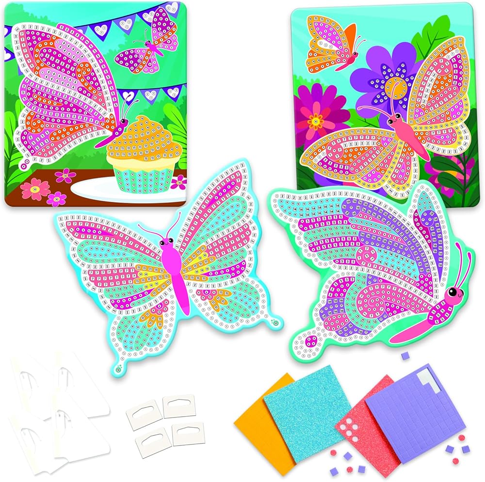 اصنع تحفة فنية مع فراشات الفسيفساء اللاصقة! مجموعة الحرف الملونة هذه ممتعة للغاية وسهلة الاستخدام ومثالية للترفيه في المنزل أو أثناء التنقل. من السهل الحصول على نتائج رائعة في كل مرة - ما عليك سوى تقشير البلاط ولصقه على القالب وشاهد الفسيفساء تنبض بالحياة. هناك 4 تصميمات لإكمالها في كل صندوق.