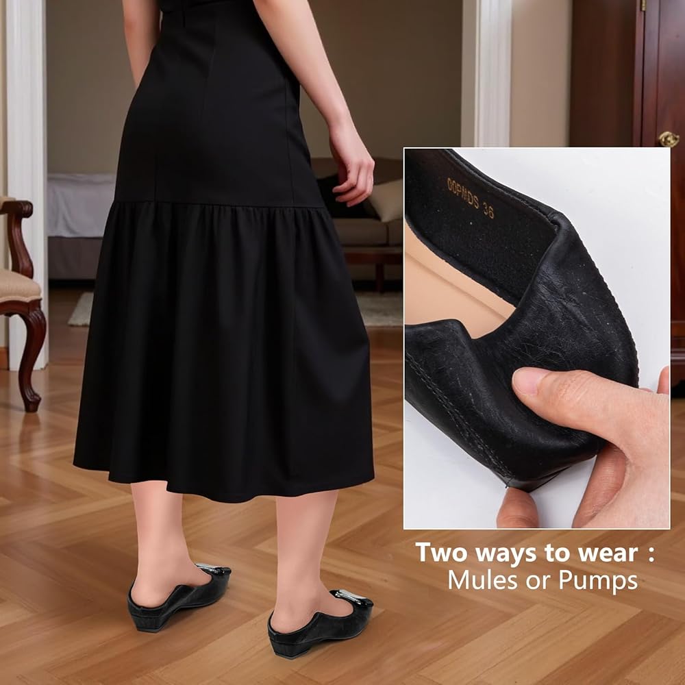 التصميم متعدد الاستخدامات 2 في 1: الانتقال دون عناء بين المضخات السوداء الكلاسيكية الدبغة والبغال الأنيقة! ما عليك سوى طي الكعب المذكور لتبديل الأنماط - مثالية لأناقة المكتب/العمل أو نزهات عطلة نهاية الأسبوع غير الرسمية.