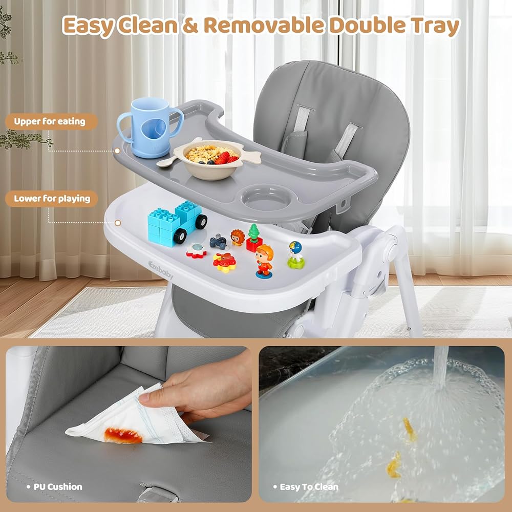 كرسي مرتفع للأطفال قابل للطي من Ezebaby، كراسي عالية قابلة للتحويل 3 في 1 إلى مقعد معزز، كرسي مرتفع محمول مع ارتفاع قابل للتعديل واستلقاء، صينية قابلة للإزالة وشريط ألعاب