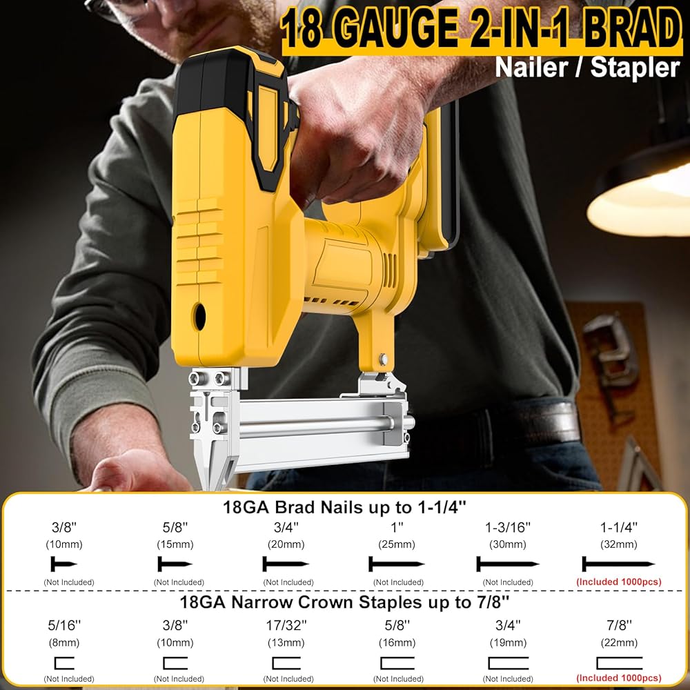 2-in-1 مسدس الأظافر اللاسلكي: هذا مسدس الأظافر الكهربائي يقود مجموعة واسعة من الأظافر 18GA Brad (3/8 "إلى 1-1/4") و 18GA Crown 1/4 "Staples (5/16" إلى 7/8 "). إنه يأتي مع 1000 مسامير Brad (1-1/4")