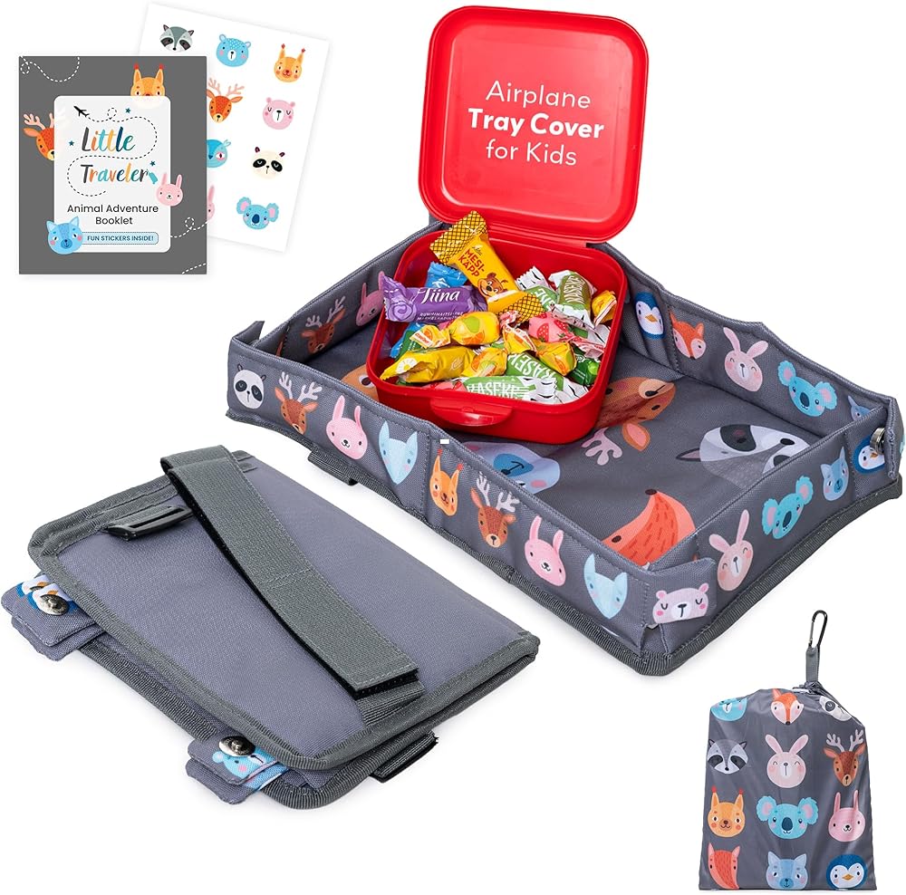 تصميم رائع: يتميز غلافنا بأنماط حيوانات وودلاند الساحرة بما في ذلك الثعالب والكوالا والأرانب والغزلان على خلفية رمادية. إنها أكثر من مجرد صينية السفر للأطفال - إنها طريقة لجلب القليل من الفرح لتجربة سفر طفلك.