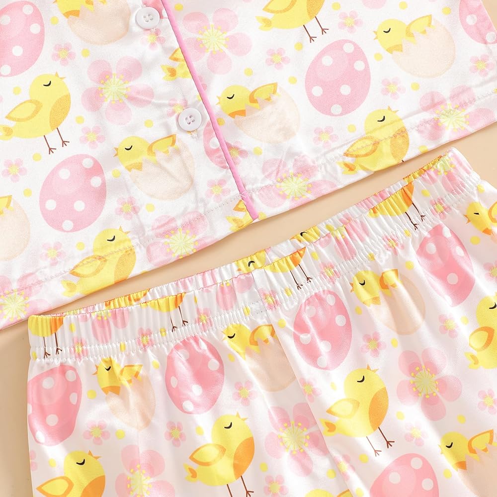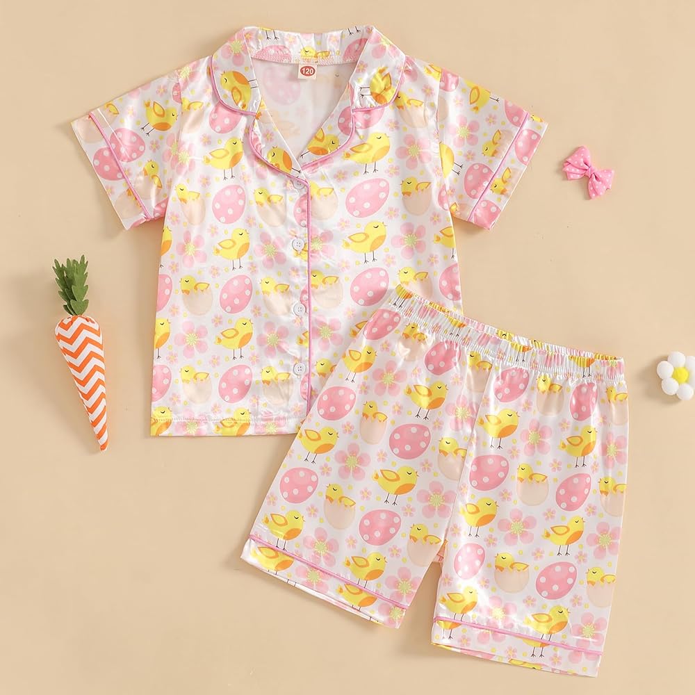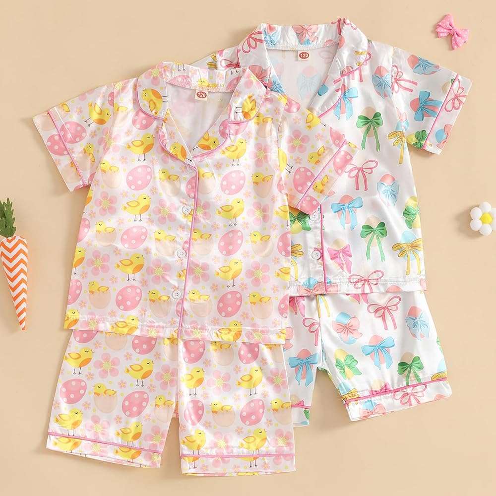• Easter Bunny Pajamas: 2 piece silk pajamas for girls, short sleeve button down t-shirt tops and elastic waist shorts, bunny/bow/carrot/rabbit print pattern pajama sets, easter pjs for girls, toddler girl easter pajamas, kids easter pajamas girls, toddler easter bunny pajamas girl, girls summer pajamas, super adorable and beautiful sleepwear outfit