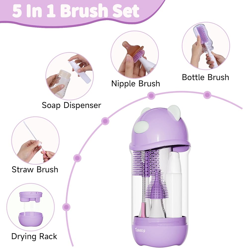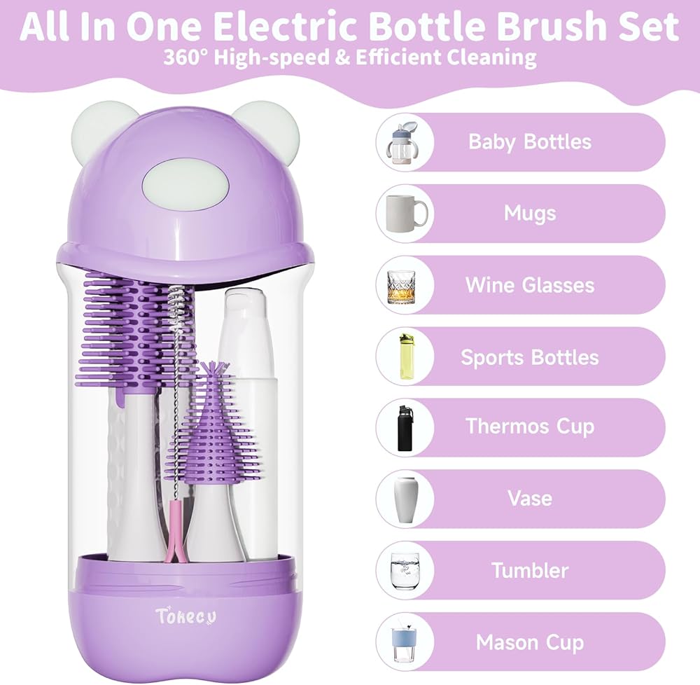 مجموعة منظف فرشاة الزجاجة الكهربائية ، مجموعة منظف زجاجة أطفال على شكل دب مع فرشاة سيليكون وفرشاة القش ، موزع الصابون ، رف الصرف ، صندوق التخزين (الأرجواني)