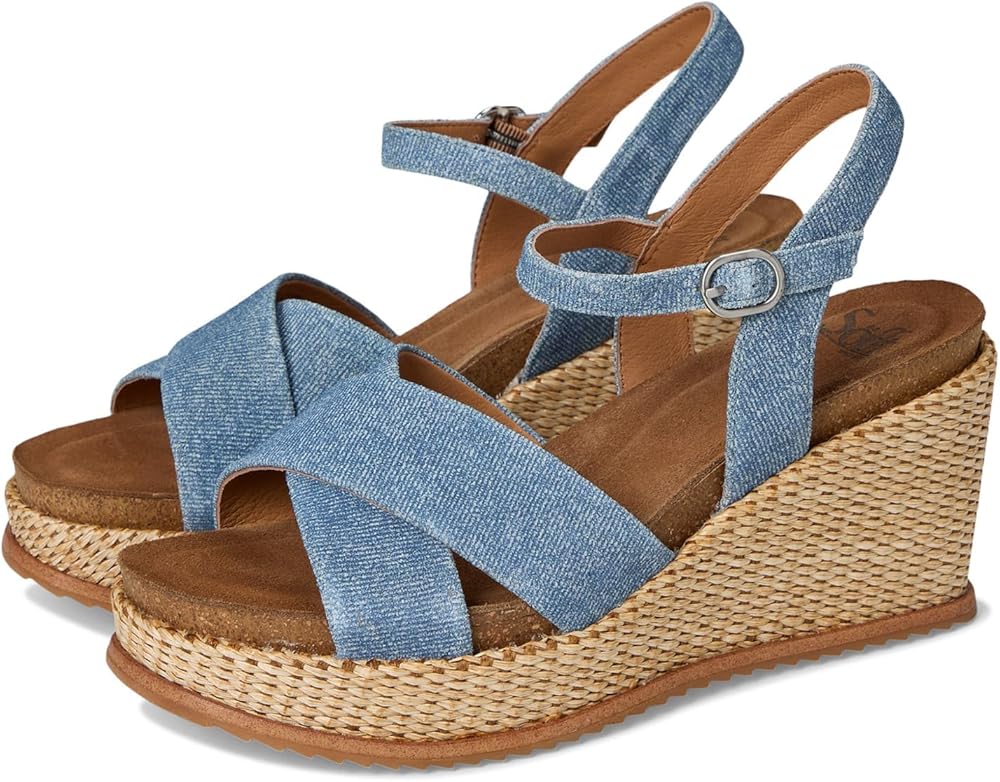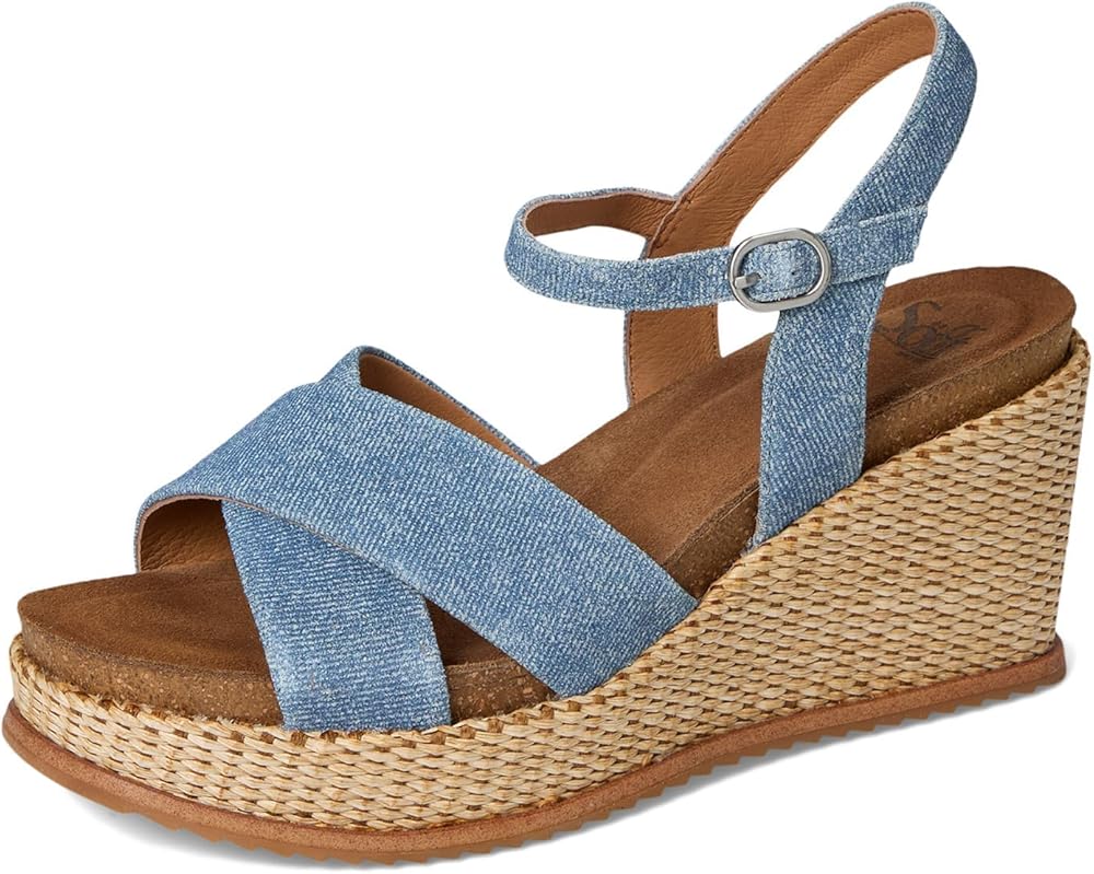 two piece leather upper, adjustable buckle, cross strap vamp, padded cork footbed, basket wrapped heel