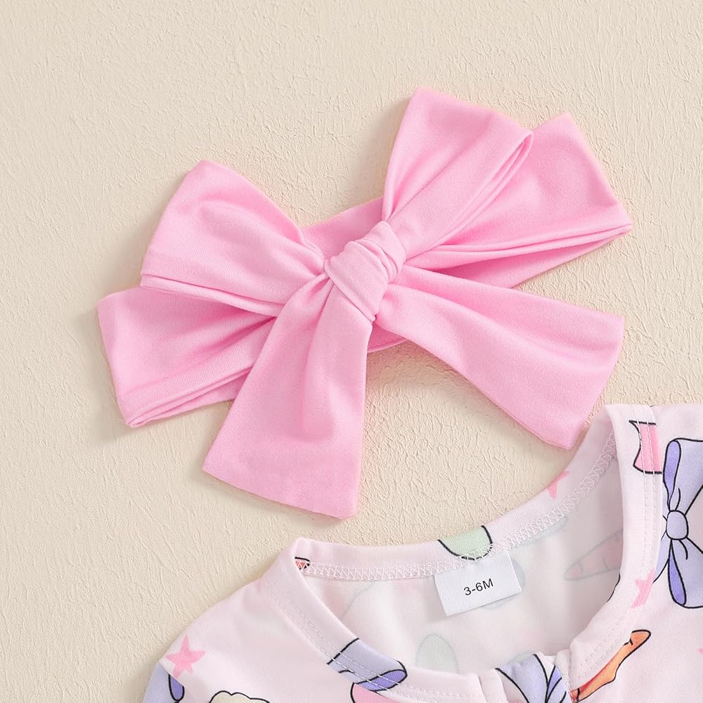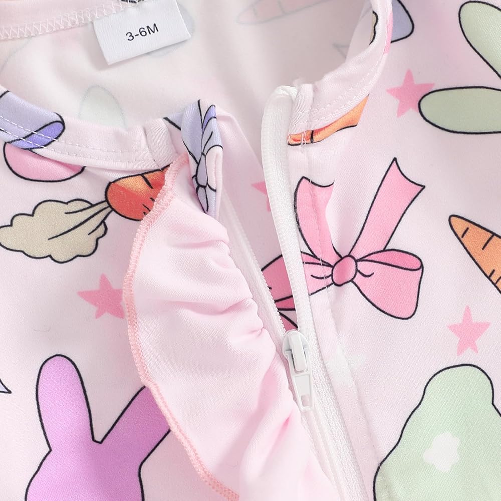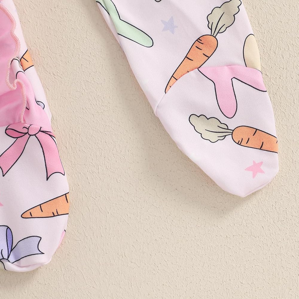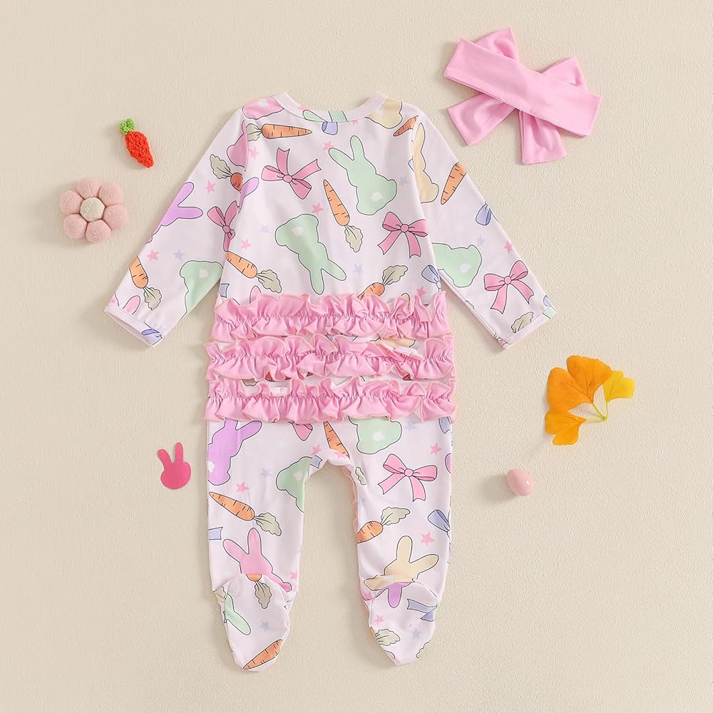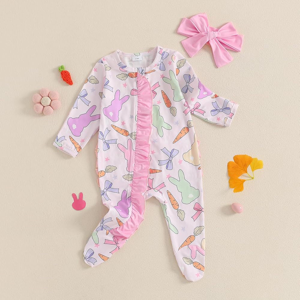 Newborn Baby Girl Easter Outfit Bow Bunny Print Footie Romper Ruffle Zipper Bodysuit Jumpsuit with Headband