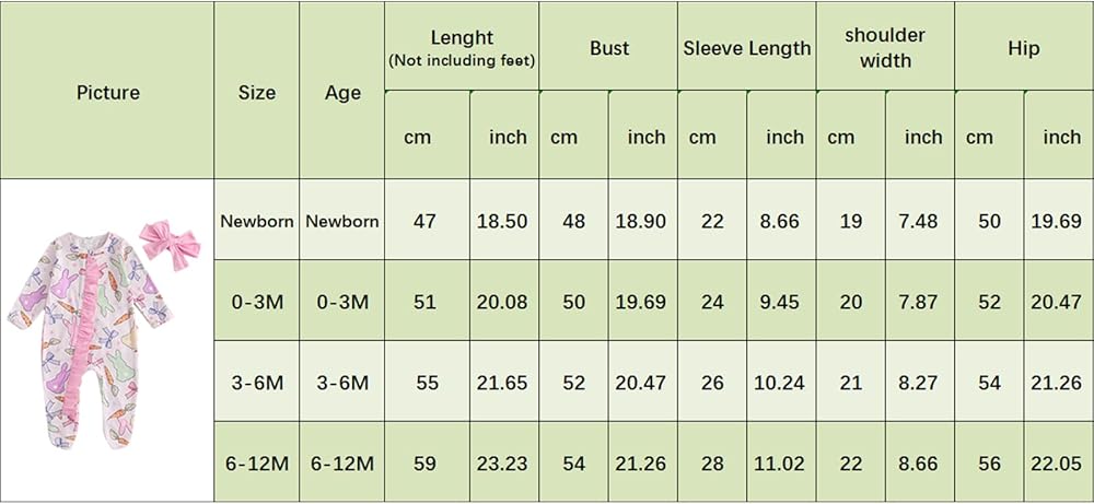 Newborn Length: 47 Bust: 48 Sleeve: 22 Shoulder: 19 Hip: 50 Advised Age: Newborn