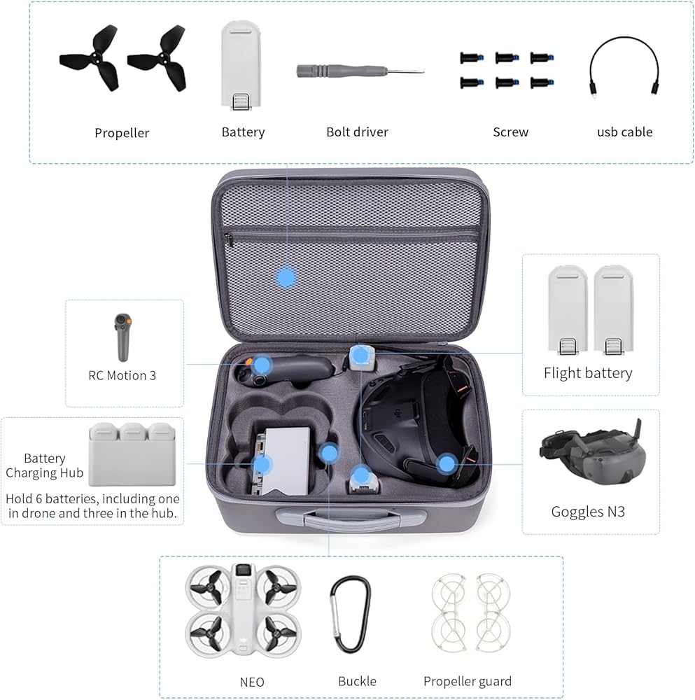 Large capacity,it can store 1* Neo drone, 1* Goggles N3, 1* RC Motion 3 controller, 1*Battery Charging Hub, 6 batteries(two in the case,one in drone and three in the hub)