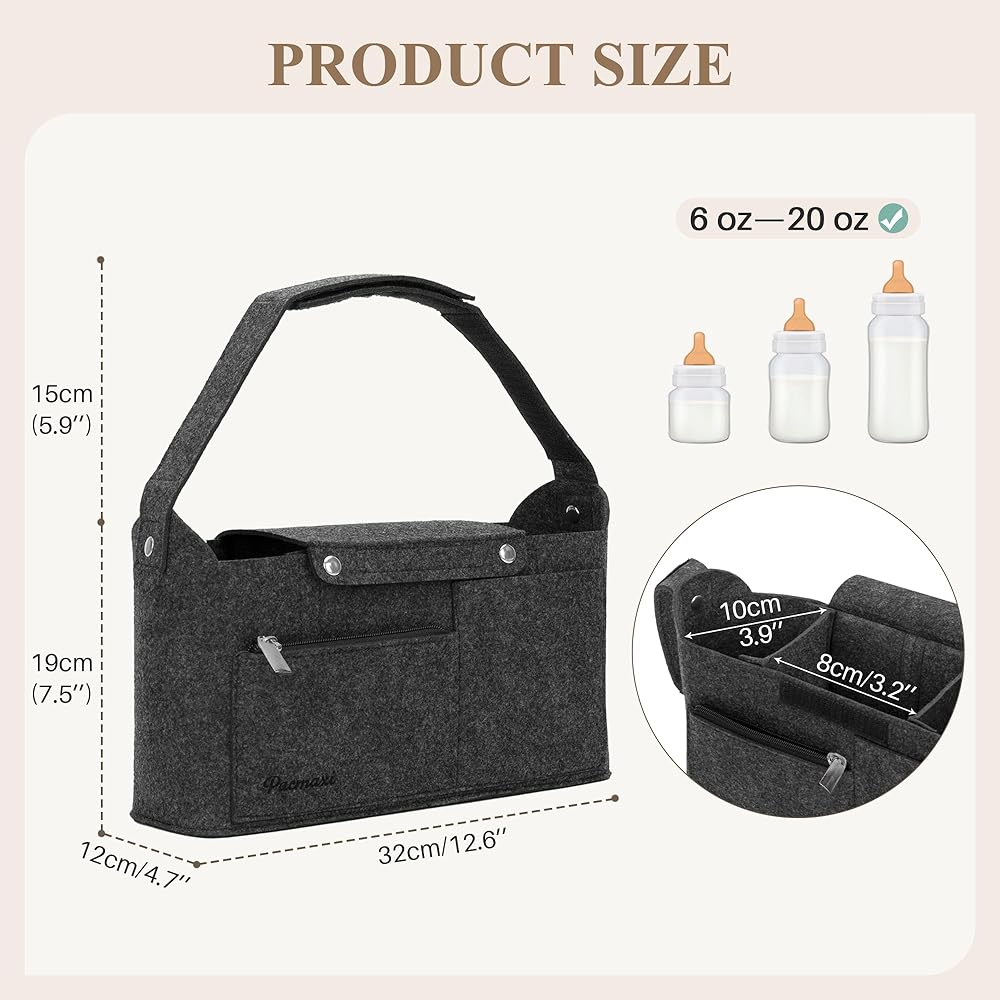 Bacmaxi Found Stroller Vercizer Bag مع حامل كوب - سعة كبيرة ، جيوب متعددة الاستخدامات ، تخزين Caddy العالمي ودائم لحفازات الأطفال ، زجاجات أساسية (أسود)