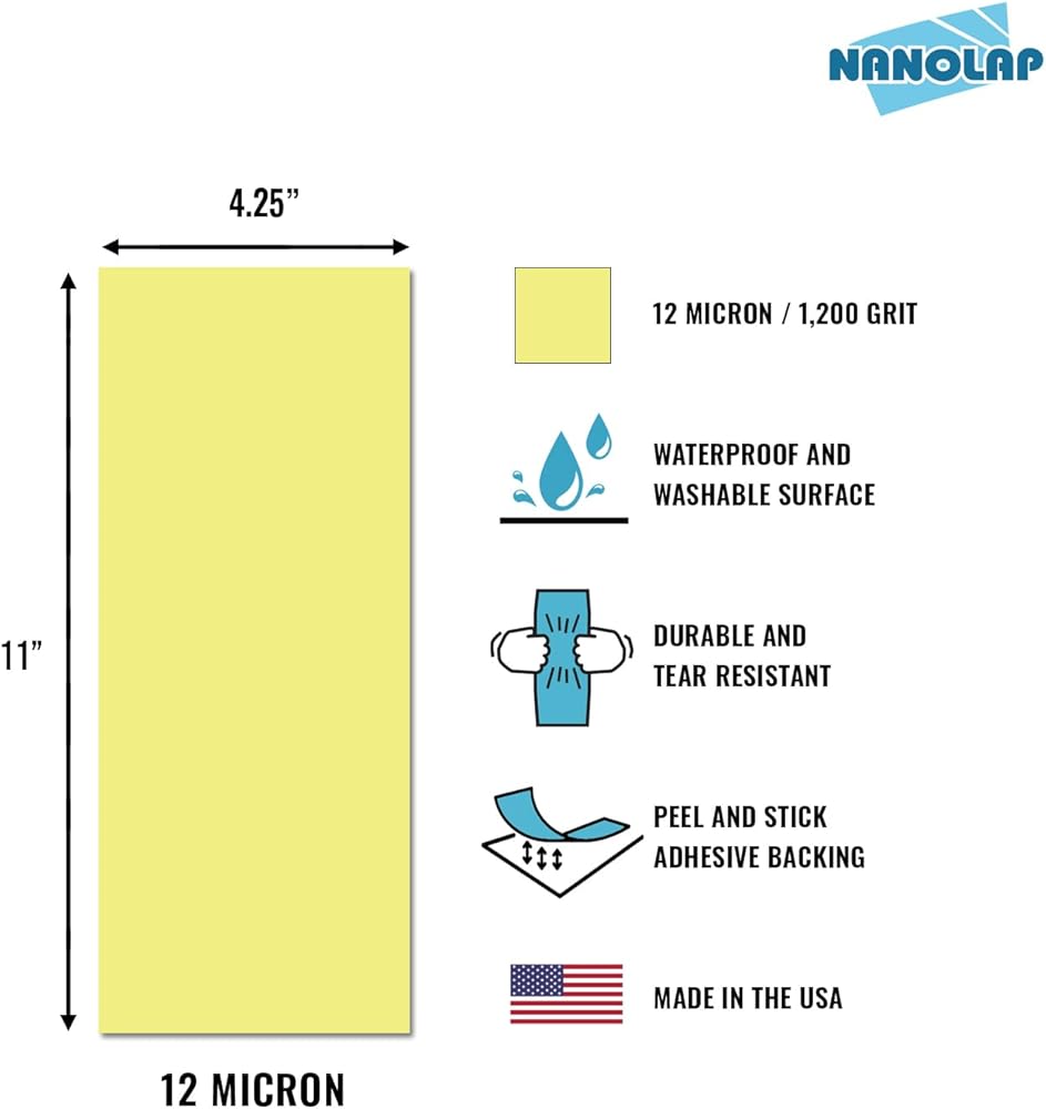 • 12.0 MICRON SIZE: The ultrafine 12.0 micron (1,200 grit/yellow) lapping film sheet provides one of the middle stage steps for producing ridiculously sharp blades with an impressive mirror-like finish.