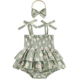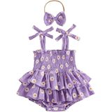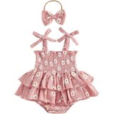 Infant Toddler Baby Girl Romper Sleeveless Shirred Layered Hem Elastic Leg Lace Flower Embroidery Tie Up Jumpsuit