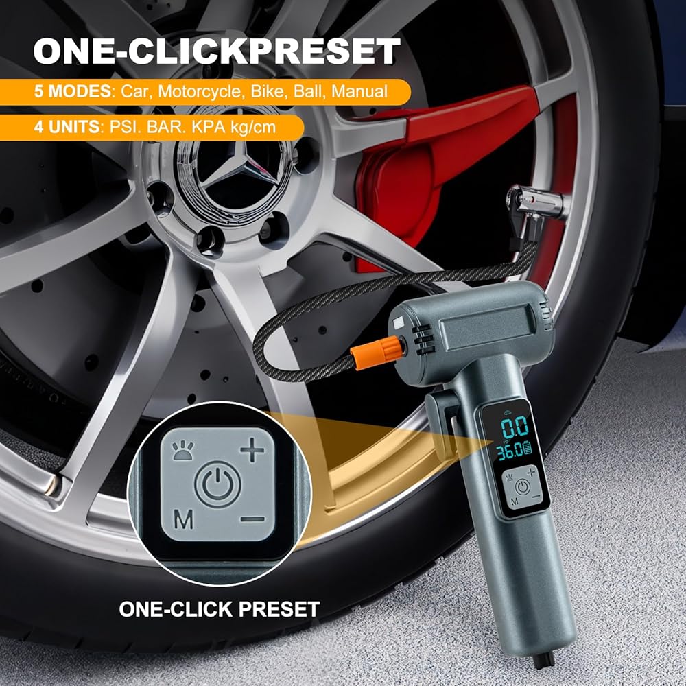 • خمسة أوضاع ذكية: يحتوي نفخ الإطارات القابل لإعادة الشحن على خمسة أوضاع توسع ، مما يجعله مناسبًا للسيارات والدراجات النارية والدراجات والكرات وما إلى ذلك. يمكن تعديل وضعه القابل للتخصيص بسهولة إلى أي ضغط بين 3 - 150psi. تتوفر أربع وحدات: PSI ، KPA ، BAR ، KG/CM² لتلبية احتياجات التضخم المختلفة. إنه منتج لا بد منه للحياة اليومية والسفر.