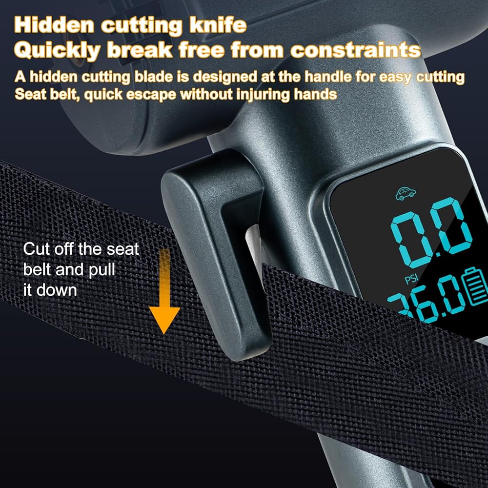 • التصميم البشري: يحتوي نفخ إطارات السيارات المحمولة على مضخة ضغط هواء مدمجة ومطرقة معدنية مخبأة في القاع. عندما يتم الضغط عليها بشدة ، يمكن أن يوفر تأثيرًا قويًا. تم تصميم مطرقة السلامة هذه لتحطيم الزجاج المقسى بسرعة وفعالية في حالة طوارئ لضمان الهروب السريع. إذا لم تتمكن من إطلاق سراح نفسك من مقعد السيارة ، فقد تم تصميم المقبض باستخدام قاطع مخفي. يمكن أن تمنع الشفرة المخفية الأذى للناس. يمكن لقطعة حزام المقعد الحادة من الفولاذ المقاوم للصدأ قطع حزام الأمان بسهولة.