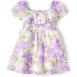 FIT & DESIGN: Square neck with ruffle trim, short puff sleeves with elasticized cuffs, above-knee length