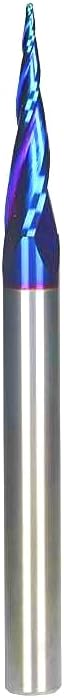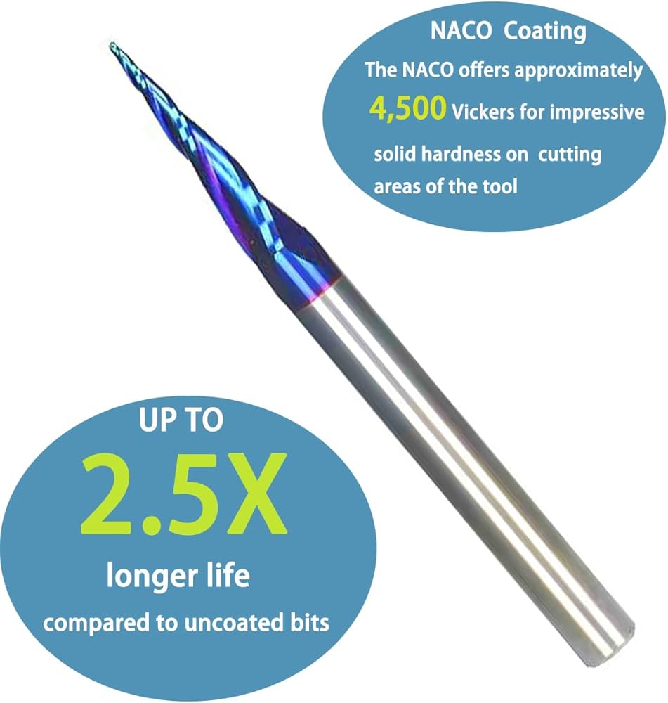 Industrial Solid Carbide CNC 2D and 3D Carving Tapered Ball Nose. NaCo Coated Router Bit allows you to achieve precision, depth, unparalleled accuracy, detail and clarity in foam and other modern-day materials. The overall length is 3" with a 1/4" shank. With the added coating, the bit's lifespan and durability are increased substantially avoiding unnecessary down time. These bits pull the wood chips up and away from the tool path which helps prevent tool breakage and extends the life of the bit.