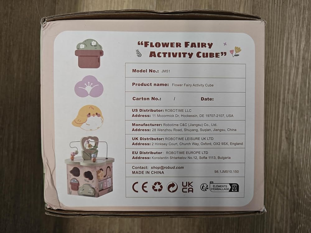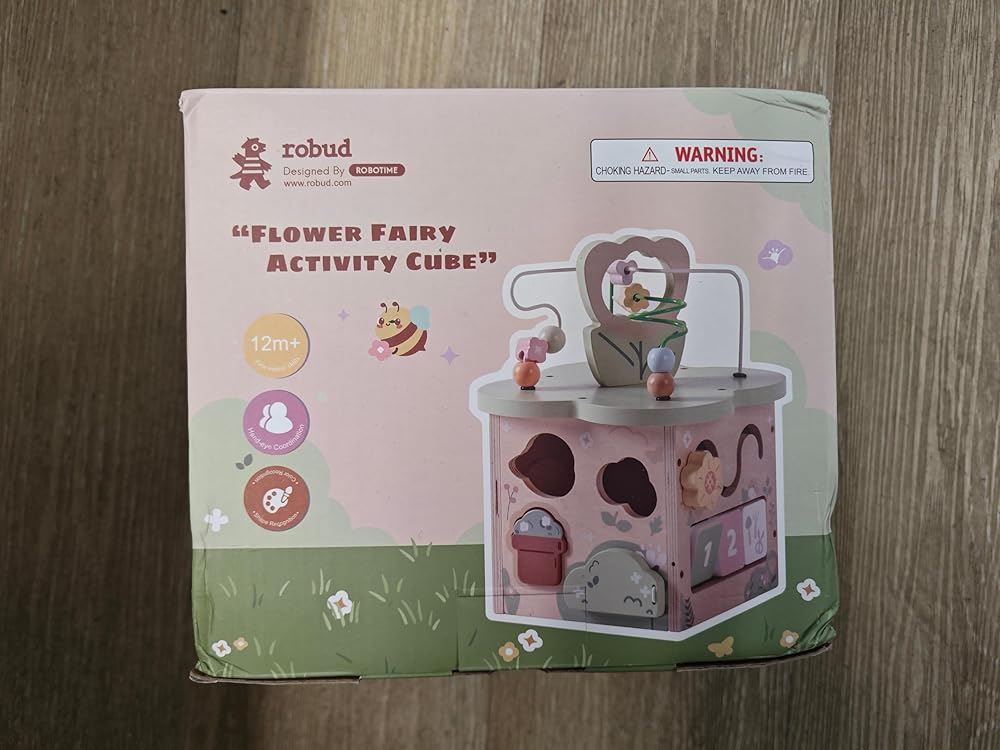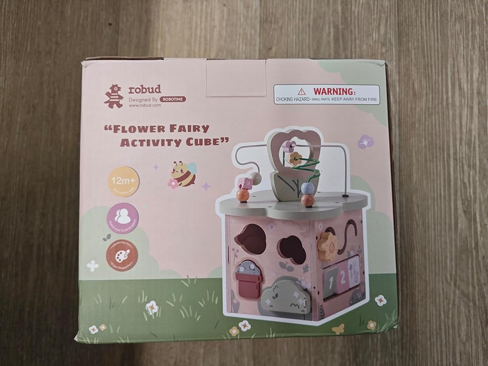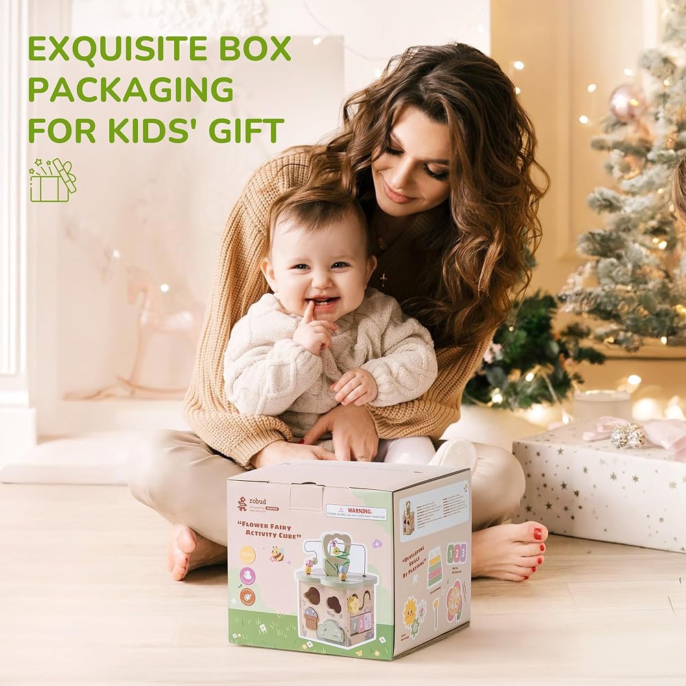 روبود النشاط الخشبي مكعب ، ألعاب خشبية تعليمية مع 7 مناطق وظيفية ، ألعاب مونتيسوري للبنين والبنات البالغ من العمر 1 سنة ، موضوع شجيرة الزهور