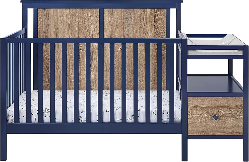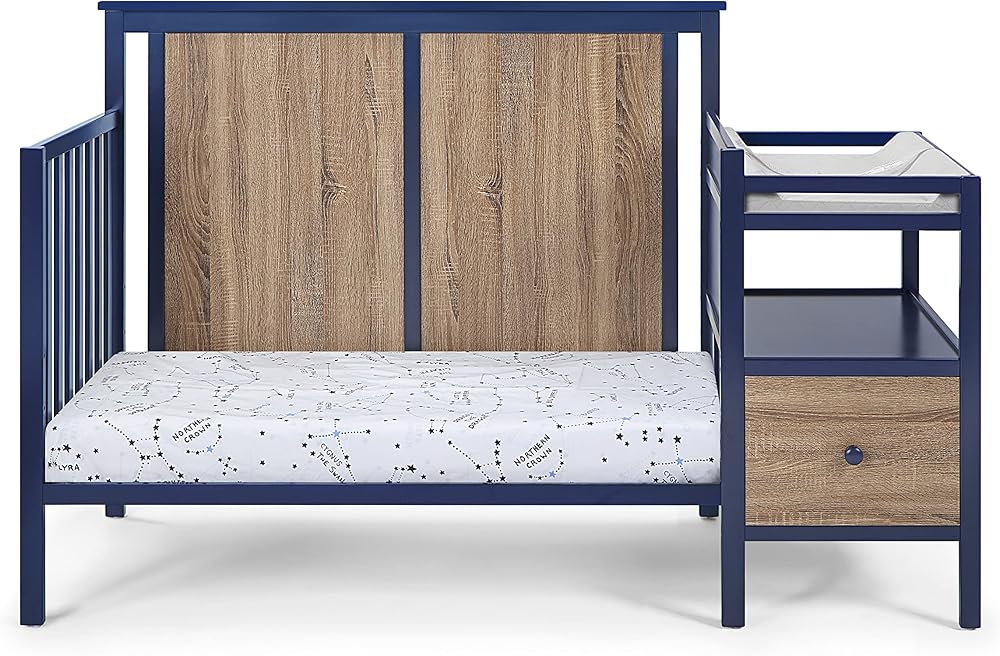 The Suite Bebe Connelly Crib and Changer Combo is a great space saver and a nod to the style of the regular Connelly collection. Classic lines with contemporary dual tone finishes demand the attention in the room. Designed with a two-sided back panel, you can display this crib with contemporary decorative two-tone veneers or flip it around for a more traditional solid finish look. The crib with attached changing table has two spacious shelves for storing all of the necessities. The Connelly CNC offers three position mattress support for ease of use and solid wood construction for optimum safety.