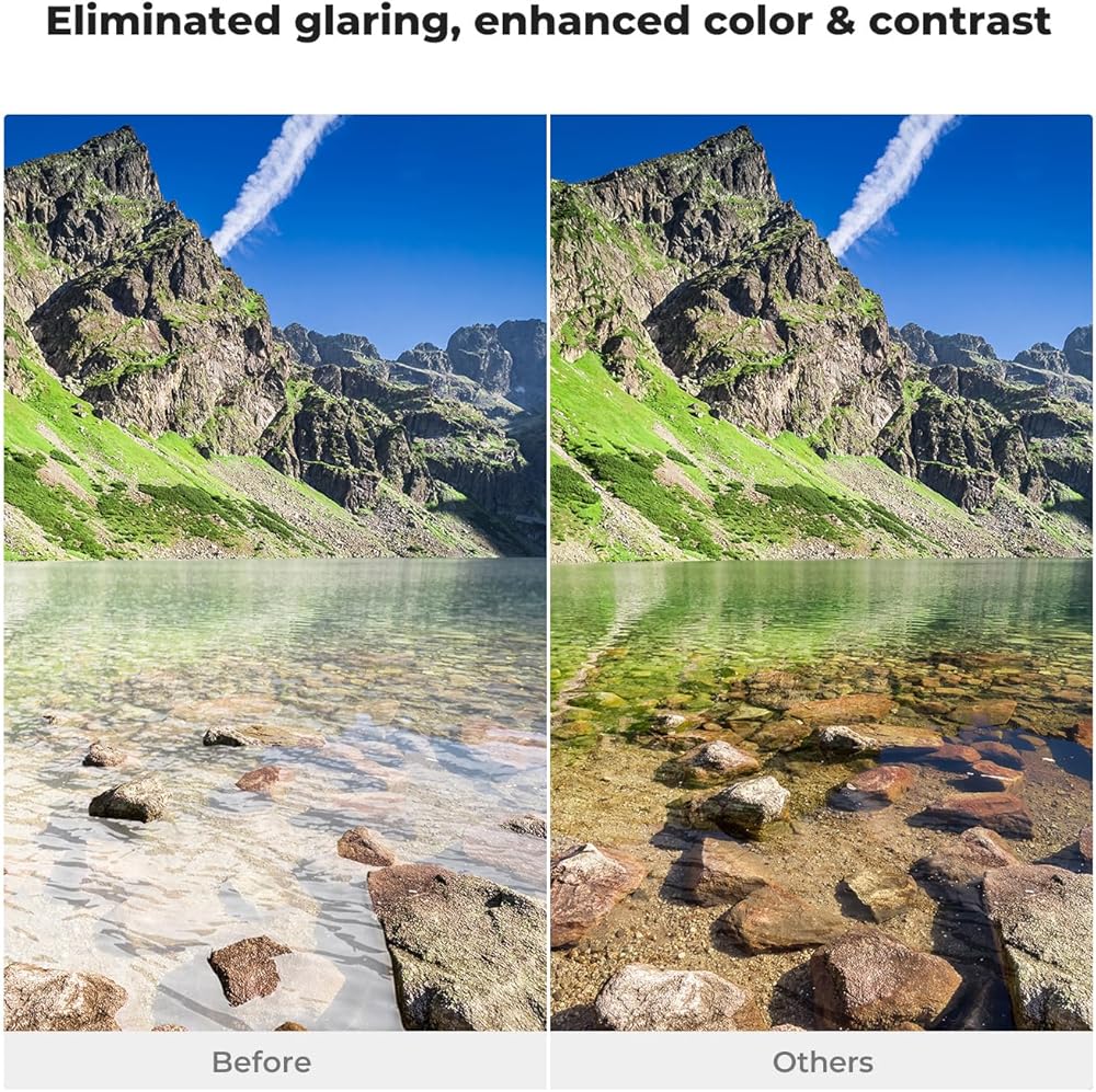• 【تعزيز اللون والتباين】 مرشح CPL يمكن أن يعزز اللون والتباين ، وإزالة الانعكاسات غير المعدنية مثل الماء ، والزجاج لإظهار اللون الحقيقي ، وخاصة المستخدمة في تصوير السحابة البيضاء والسماء الزرقاء.