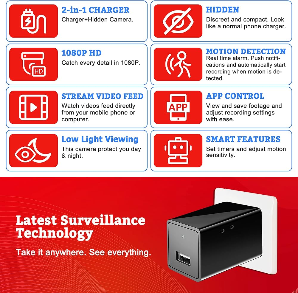 1. 【شاحن الكاميرا الخفي بالكامل 1080 بكسل】 تجربة جودة فيديو واضحة من خلال الدقة 1080p HD الخاصة بشاحن الشاحن Mini Charger. تصميمه الأنيق يجعله غير مرئي تمامًا ، ويمزج بسلاسة مع محيطك.