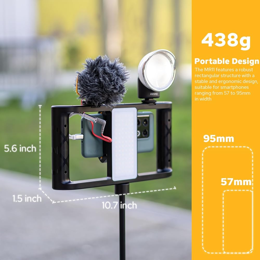 • Rugged Construction: The MR11 smartphone video rig features a robust rectangular structure with a stable and ergonomic design, suitable for smartphones ranging from 57 to 95mm in width.