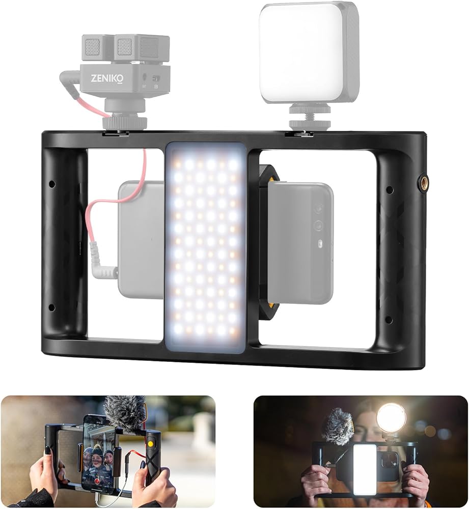 What's in the box: 1.ZENIKO OC-D1 Microphone Microphone x1 Furry Windscreen x2 USB-Type C Charging Cable x1 Storage Bag x1 User Manual x1 2.ZENIKO MR11 Smartphone Video Rig Smartphone Video Rigx1 Charging Cablex1 Bluetooth Remote Controlx1 3.ZENIKO VS5R Magnetic RGB LED Video Light Light Body x1 Coldshoe Mountx1 USB to Type-c Charing Cablex1 Collapsible Diffusion Domex1 Instruction Manualx1