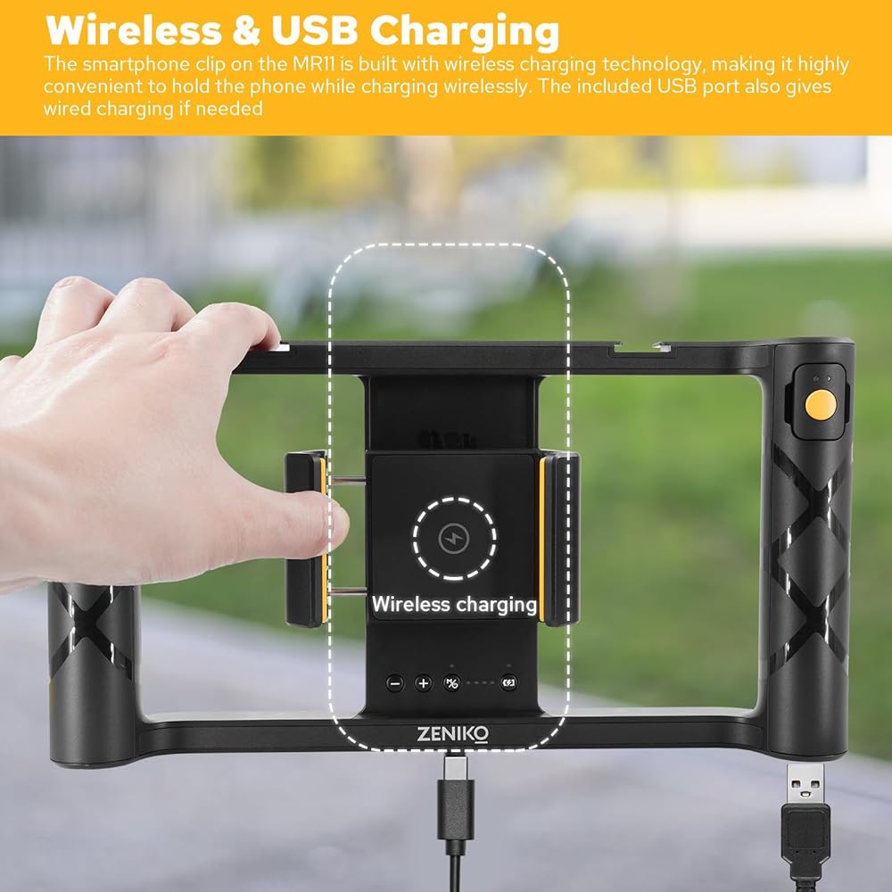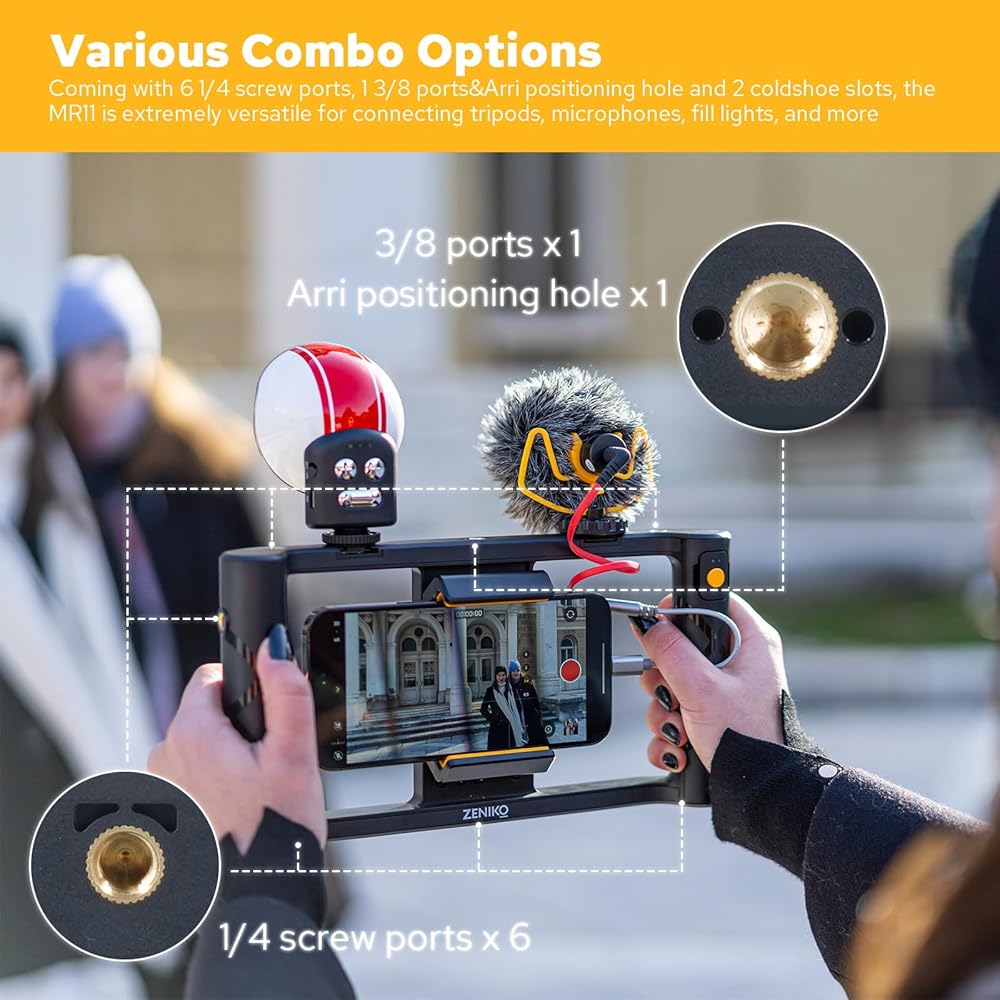 Rugged Construction: The MR11 smartphone video rig features a robust rectangular structure with a stable and ergonomic design, suitable for smartphones ranging from 57 to 95mm in width.