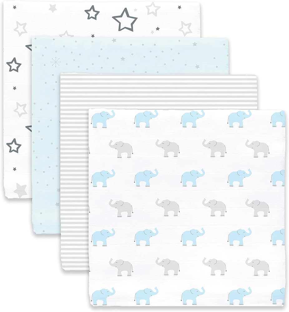 مجموعة مذهلة من قماط الطفل ، الأفيال الصغيرة الأزرق الأزرق ، 3-6 شهر أكسح قماط الانتقالية مع الأذرع بأكمام نصف الطول والأصفاد القفاز وبطانيات شاش القطن 4pk ، ليلة النجوم