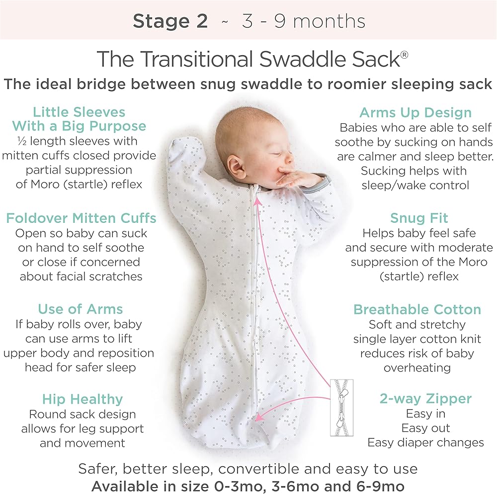 EASIEST way to move from a traditional swaddle to a wearable blanket; The Transitional Swaddle Sack is not a tight swaddle nor a loose sack; the snug fit helps baby feel secure and the special sleeves allow baby to use their arms for SAFER & BETTER SLEEP