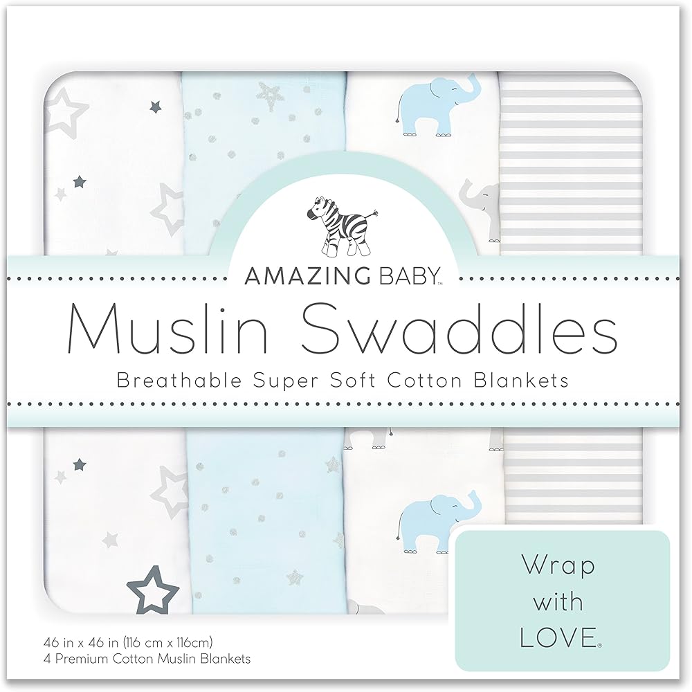 Amazing Baby Swaddle Set includes our most-loved Transitional Swaddle Sack and a set of 4 coordinating cotton muslin Swaddle Blankets. The Transitional Swaddle Sack is ideal for babies who prefer to sleep with arms up and babies who are starting to rollover. The uniquely-shaped, ½-length sleeves are not full length, so when mitten cuffs are closed, baby's arms will be flexed close to body for swaddle snugness. The foldover mitten cuffs may be worn open or closed. Helpful 2-way zipper with 2 zipper pulls. The zipper zips down from the neck to make it easy to place baby in the sack and zips up from the feet to make it easy to change baby's diaper. Our soft and breathable, openweave cotton muslin swaddles are an every day baby essential. Each blanket in set of 4 measures 46 x 46 inches (116 x 116 cm). The generous size and our helpful labels make swaddling easy as 123. Beyond swaddling, use when feeding baby, as a sunshield, playmat for tummy time, over the stroller, and more. The cotton muslin is pre-washed to increase softness and we use premium cotton yarns to increase durability and minimize pilling. Coordinates with a variety of our quality baby essentials. Machine wash warm, tumble dry low.