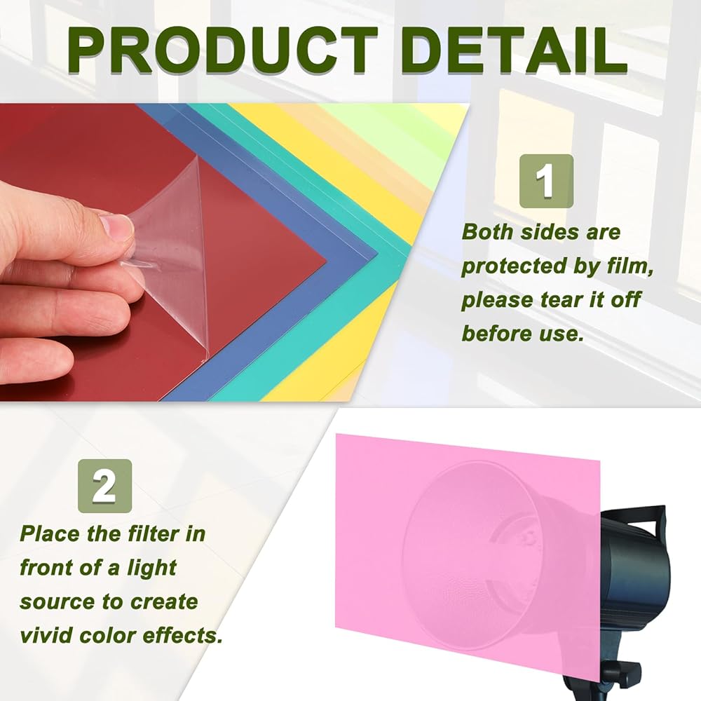 Made of waterproof and durable transparent PVC material, it has stable color temperature, low color loss and is reusable, suitable for indoor and outdoor use. Easy to cut, you can easily cut the plastic film into different shapes to meet different needs. You can also stack filters of the same color together to achieve the desired tone and effect in various applications. Both sides of each colored film pvc sheet are protected by a tear-off film to maintain clarity.