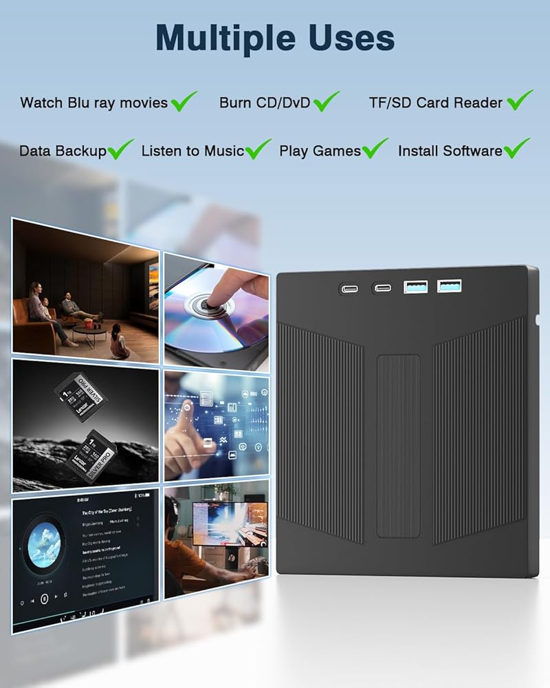 [دعم 100 جرام قدرة/كتابة وتأثير ثلاثي الأبعاد - مقارنة مع الموقد العادي ، يدعم محرك Bluray سعة 100 جرام القراءة/الكتابة مع CD/DVD/BD. علاوة على ذلك ، يدعم مشغل Blu Ray الخارجي للكمبيوتر الشخصي ما يصل إلى 1080 دقة ويجعل تأثيرًا ثلاثي الأبعاد ، يمكنك مشاهدة الأفلام ، وتشغيل الألعاب مع صور أكثر وضوحًا ومرضية على جهاز الكمبيوتر الخاص بك أو الكمبيوتر المحمول.