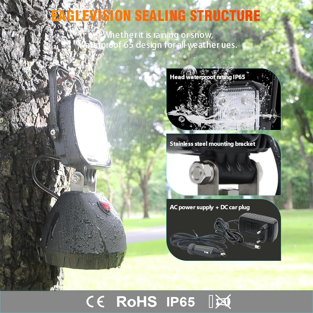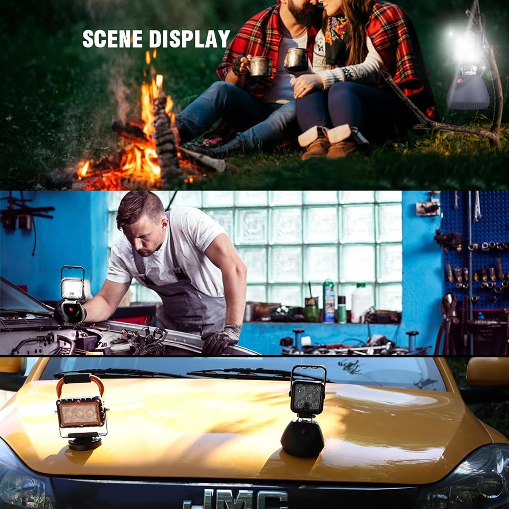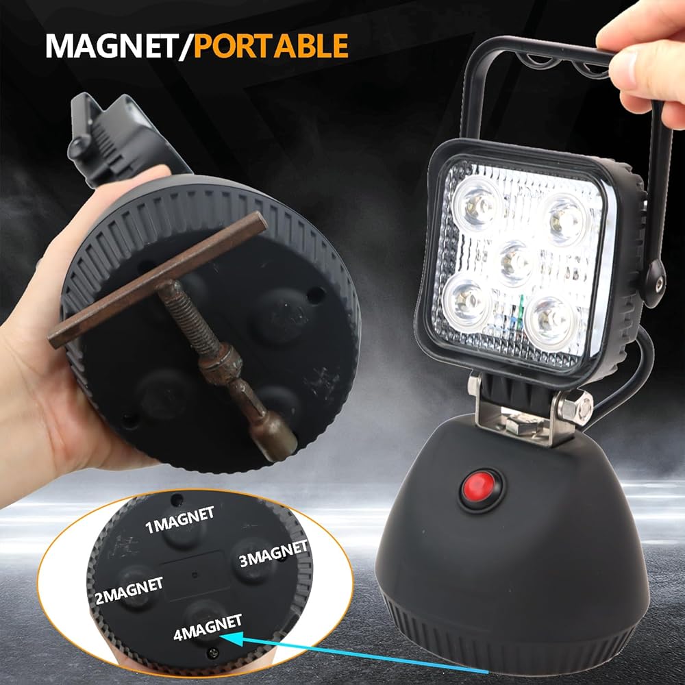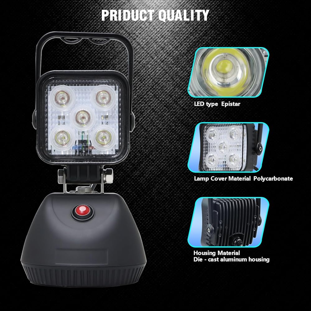 عمر طويل: مع عمر يصل إلى 30،000 ساعة ، تم تصميم ضوء العمل هذا للاستمتاع. شحن الشحن: شحن الضوء باستخدام مزود طاقة التيار المتردد المضمّن (1.2 متر) أو قابس سيارة DC (1M). الوقت الشحن يصل إلى 6 ساعات ، مع معدل إعادة شحن 500 دورة.