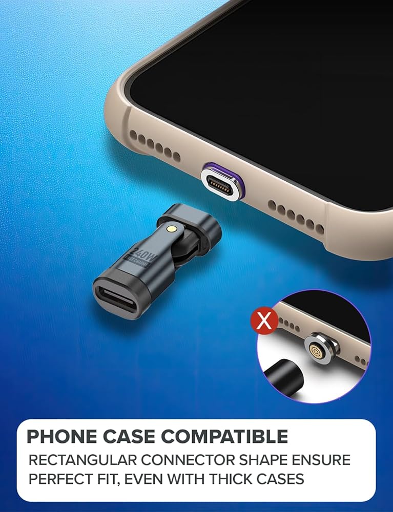 ✔ Ultra-Slim, Strong Magnetic ConnectionThe rectangular magnetic USB-C connector fits devices with thick cases and provides a stronger hold than round connectors. The magnetic USB-C breakaway design helps prevent accidental disconnections and safeguards your charging port.