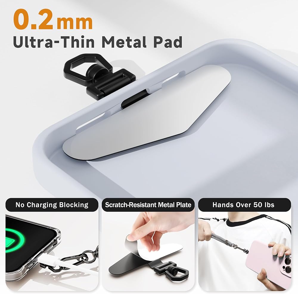 • Ultra-Thin Metal Tabs Hold Up to 50lbs: Our 0.2mm universal phone tether tab delivers a sleek, uninterrupted connection that supports both corded and wireless charging without removing your phone—featuring a 360° rotating design for flexibility