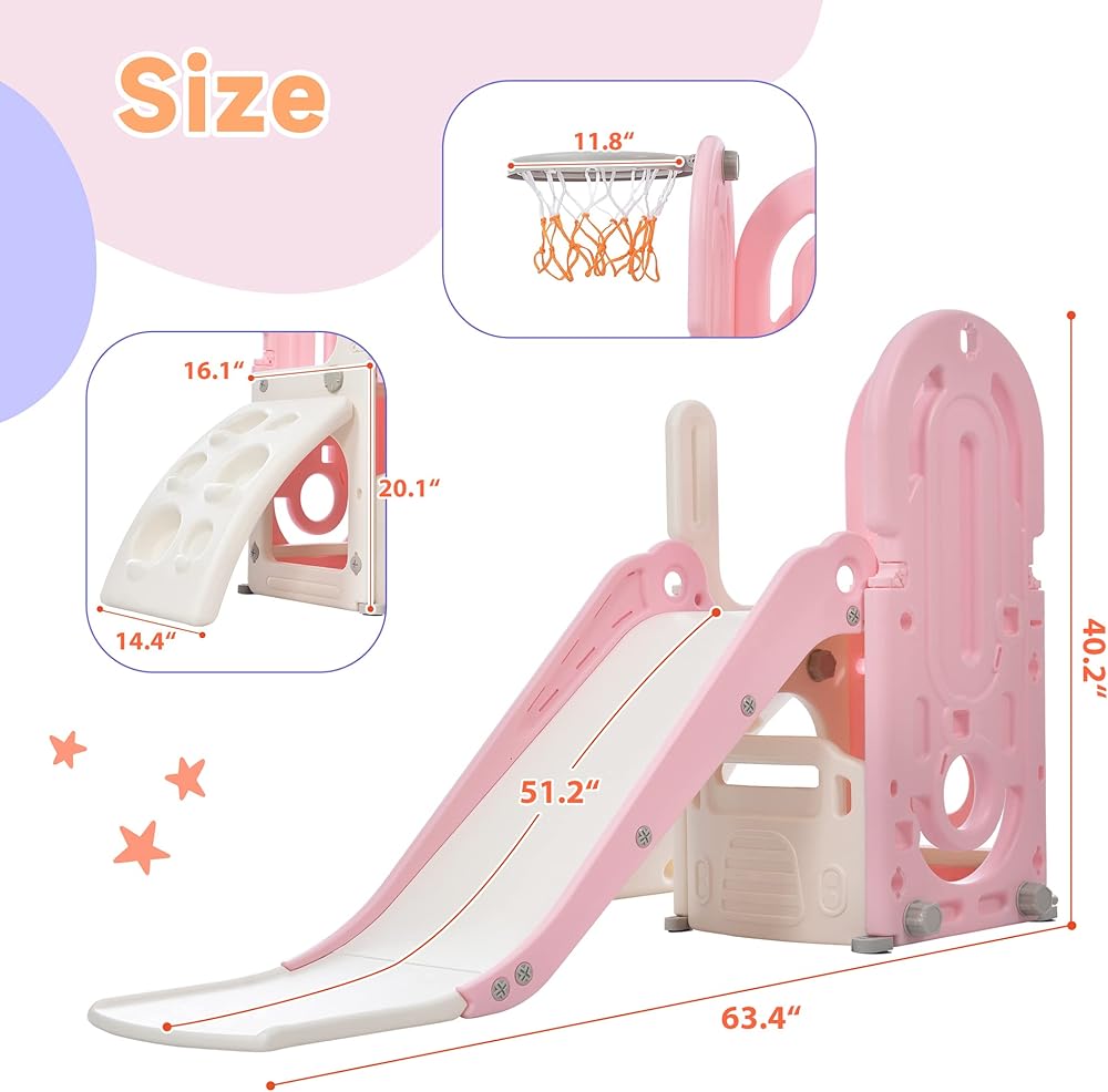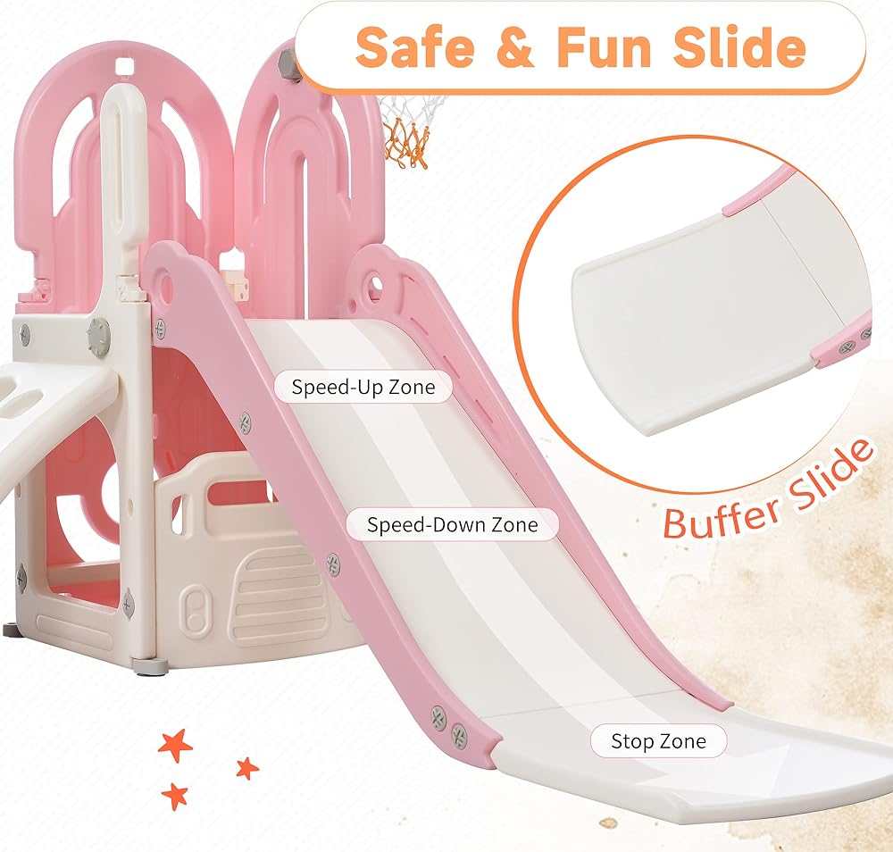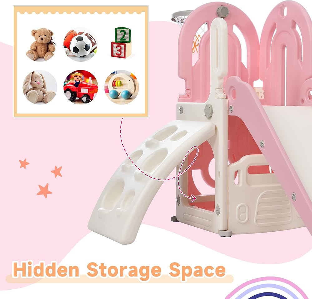 • 【مجموعة لعب منزلقة 4 في 1】مجموعة أرجوحة ومنزلقة رقيقة ولطيفة قائمة بذاتها للأطفال الصغار مع أربعة أجزاء وظيفية: 1 شريحة، 1 منحدر تسلق، 1 طوق كرة السلة، و1 مساحة مخفية لتخزين الألعاب. كل هذه الأنشطة تساعد طفلك على تطوير ذكاء أعلى، ونشاط حركي أفضل، وكل هذا أثناء الاستمتاع.