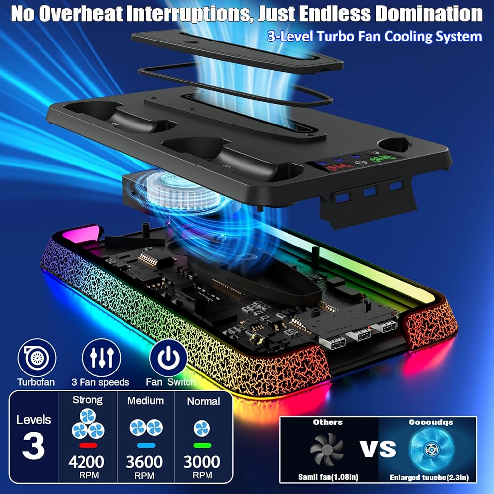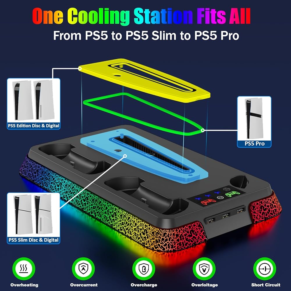 【3 محاور USB وحماية المتقدمة المتقدمة】 شريحة حماية الدائرة الذكية المعتمدة ، عندما يتم شحن بطارية وحدة التحكم حتى 90 ٪ ، تحمي محطة شحن تبريد PS5 وحدات التحكم في PS5 من الشحن المفرط ، والتفتيت ، والتواصل الزائد ، والدوائر الزائدة ، ودوائر قصيرة ، وضمان سلامة المراقبين ومستحضرات طويلة حتى فوق الليل. توفر محطة PS5 Cooler التي تحتوي على شاحن 3 منافذ USB أخرى لشحن وحدات التحكم PS5 وسماعات PS5 وكاميرا PS5 HD والأجهزة الأخرى ، من أجل شحن جميع التروس الخاصة بك أثناء الألعاب.