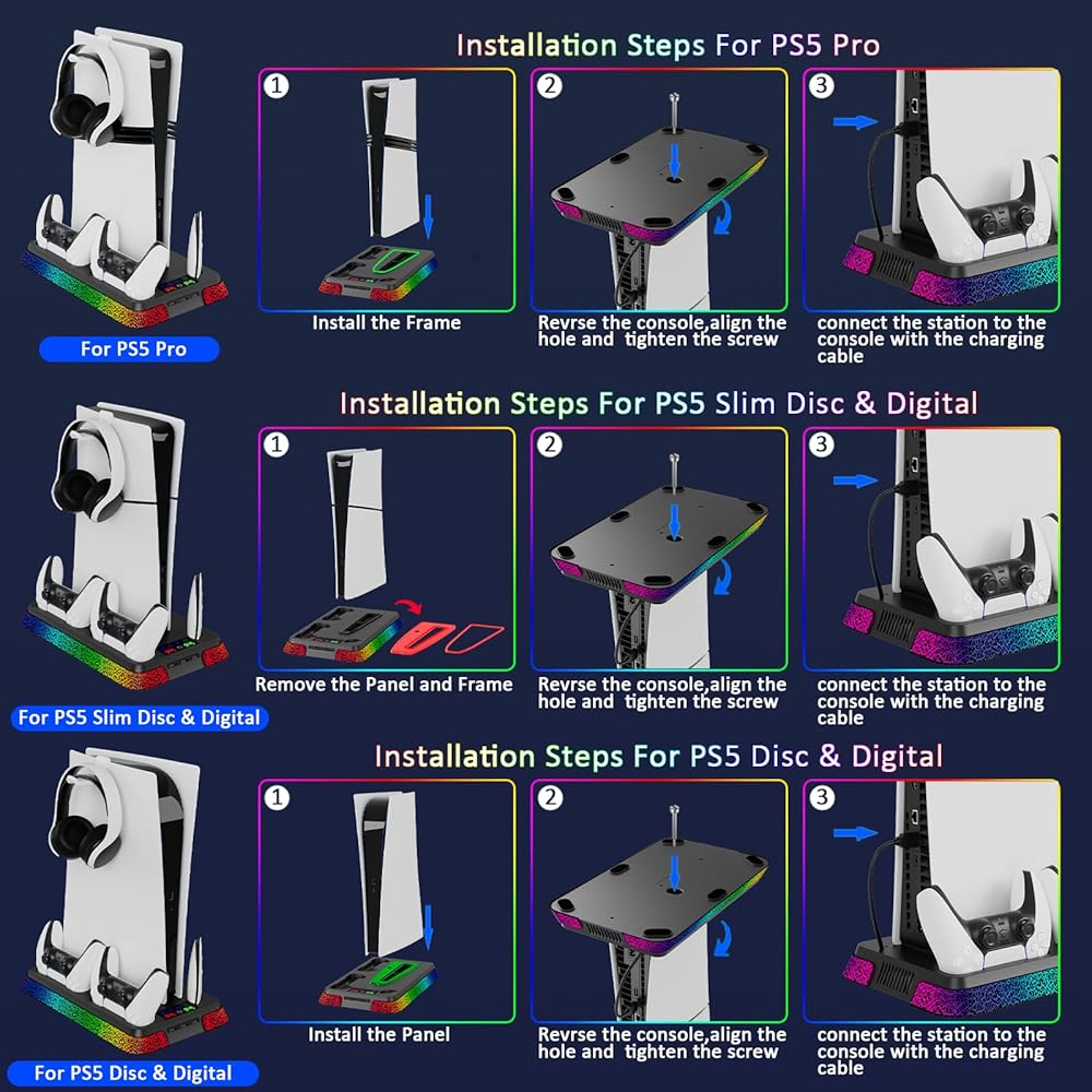 【قم بتناسب جميع Series PS5 Console Slim & Standard Disc/Digital و PS5 RPO】 الحامل النحيف PS5 مع محطة التبريد متوافق مع 2024 PS5 Pro و 2023 PS5 Slim Digital & Disc Console و 2020 PS5 Digital و Discole Console. يتم إرفاق لوحة PS5 القابلة للفصل لتناسب PlayStation 5 Digital & DISC القياسي ويتم إرفاق PS5 Pros القابلة للفصل لتناسب PlayStation 5 Pro.