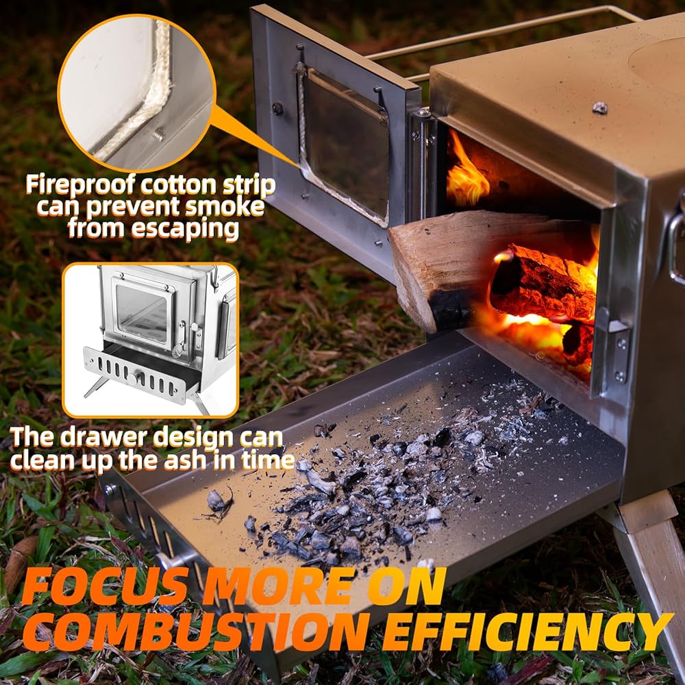 : الزجاج البصري : يمكن للنافذة الزجاجية المصنوعة من مواد الألياف السيليكون عالية الدقة التي يمكن أن تلاحظ الوضع المحترق في موقد التخييم في أي وقت. يمكن فتح المثبط تحت النافذة الزجاجية وإغلاقها في أي وقت. عندما يحترق الخشب ، إذا تم إغلاق الخانق وفتح المثبط بالكامل ، فإن النار ستكون أكبر ويمكن أن تنقذ المزيد من الخشب